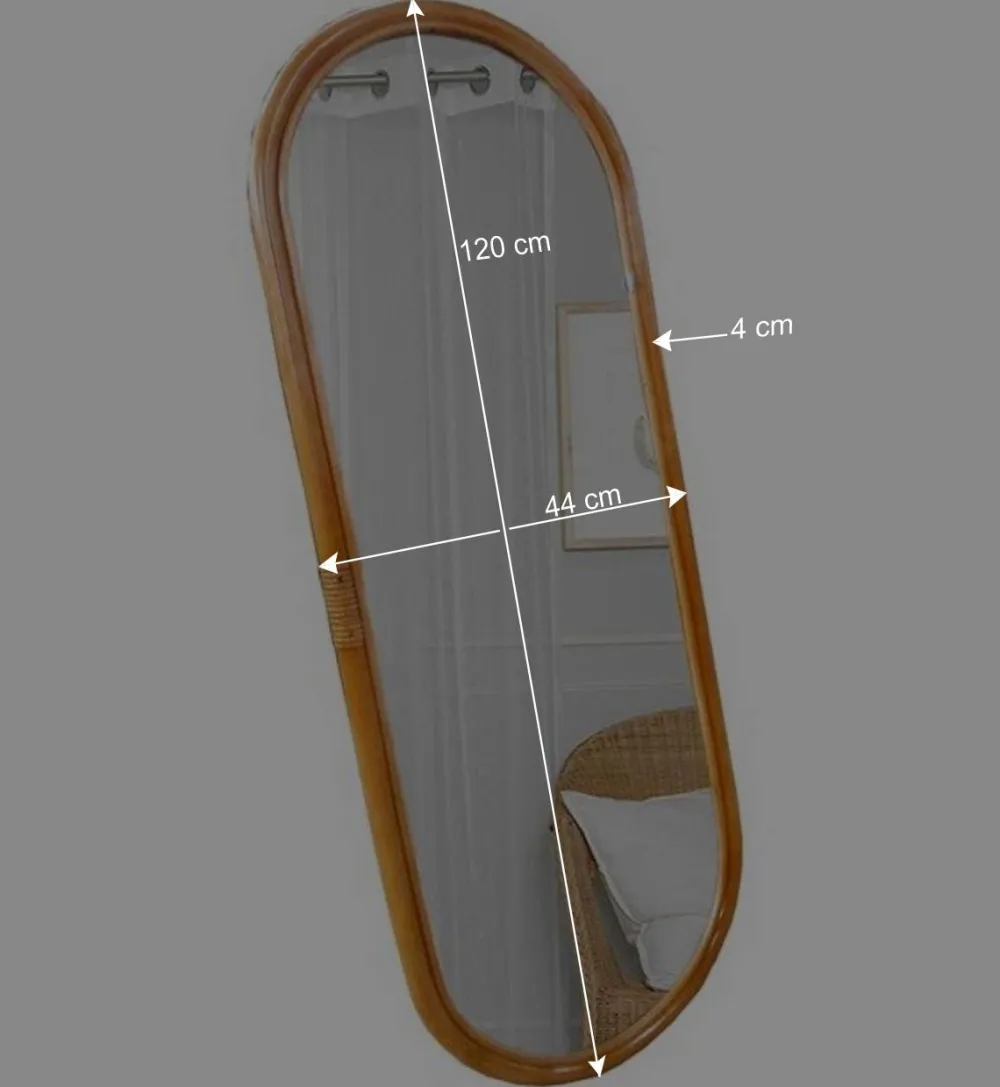 Mit einer Breite von 44 cm, einer Höhe von 120 cm und einer Tiefe von 4 cm bietet der Spiegel „Offia“ die idealen Proportionen für nahezu jeden Raum. Seine ovale Form verleiht ihm eine einzigartige Anmutung, während die mittig platzierte Spiegelfläche einen Blickfang für jeden Betrachter bildet. Der Rahmen mit einer Stärke von ca. 3,5 cm unterstreicht die Robustheit und Eleganz dieses besonderen Stücks.