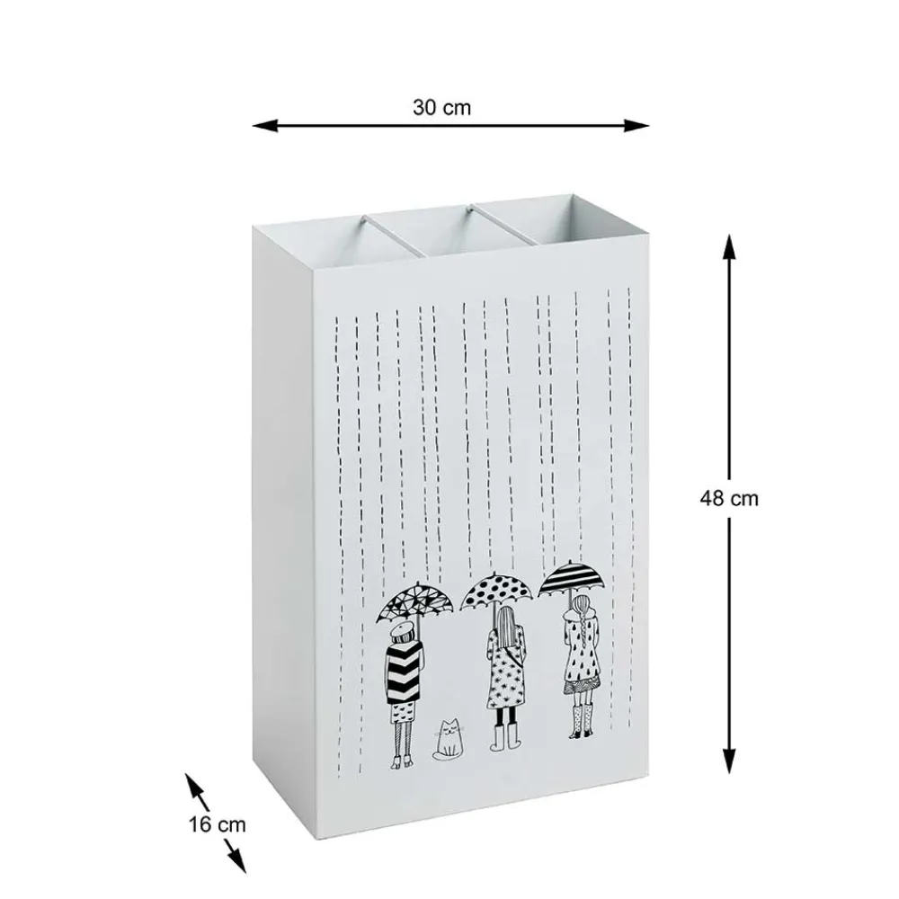 Der Schirmständer „Morian“ bringt ein Stück Poesie in den Alltag. Auf weißem Untergrund entfaltet sich ein liebevoll gestaltetes, schwarzes Motiv: Drei Damen mit geöffneten Regenschirmen schreiten stilvoll durch den Regen – von hinten zu sehen. Eine Katze, keck dem Betrachter zugewandt, komplettiert die Szene und verleiht dem Design augenzwinkernden Charme. Dieses Alltagsobjekt wird so zum kleinen Kunstwerk und bereichert moderne Dielenbereiche um eine besondere Note.