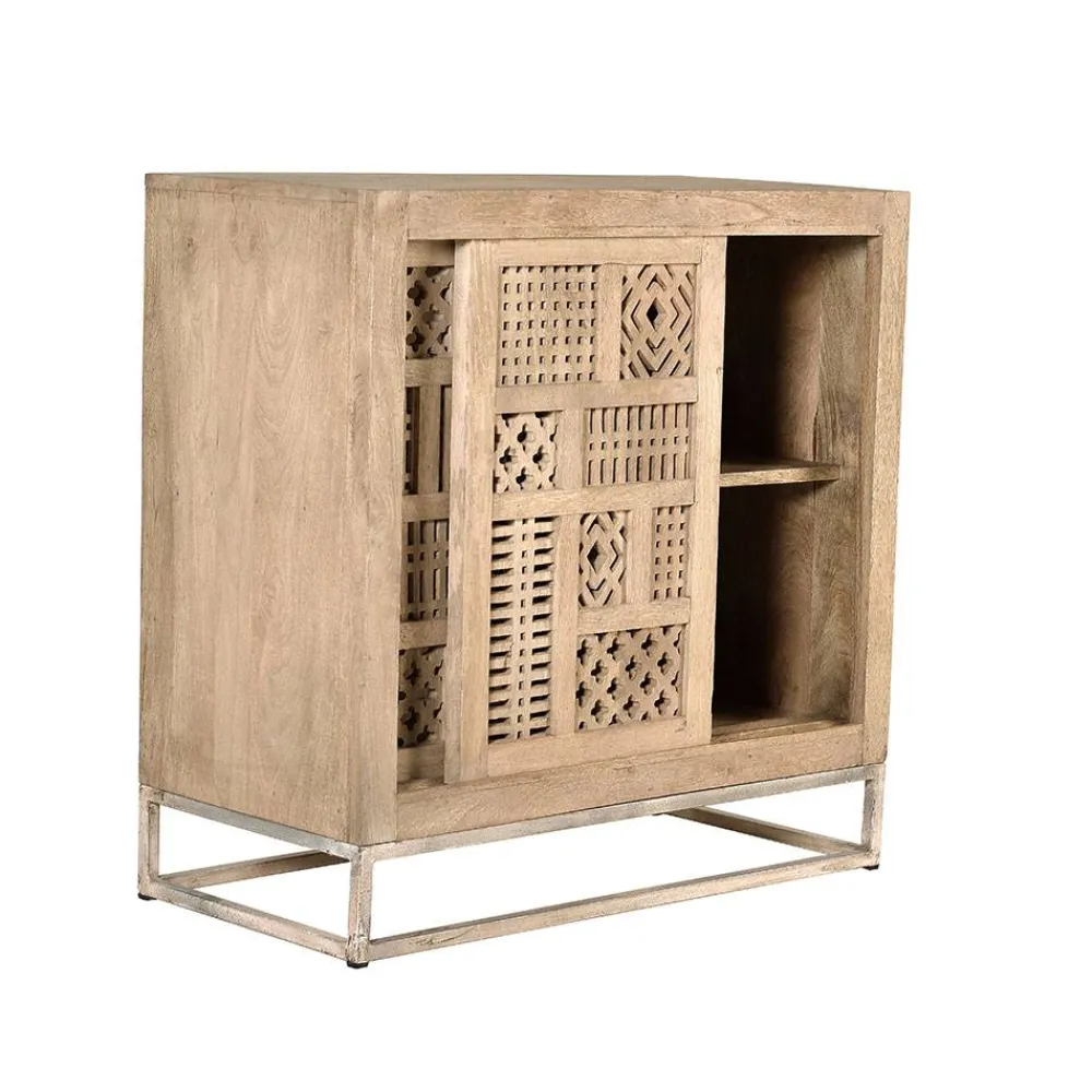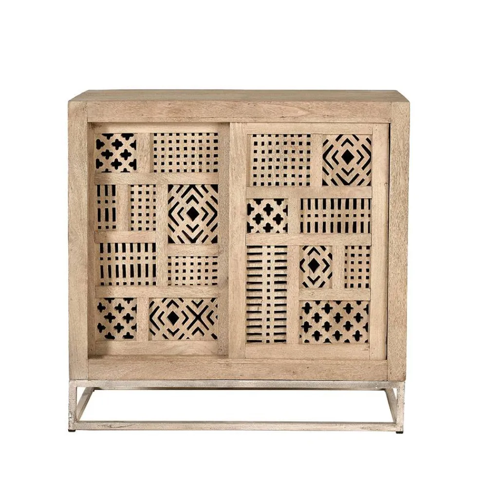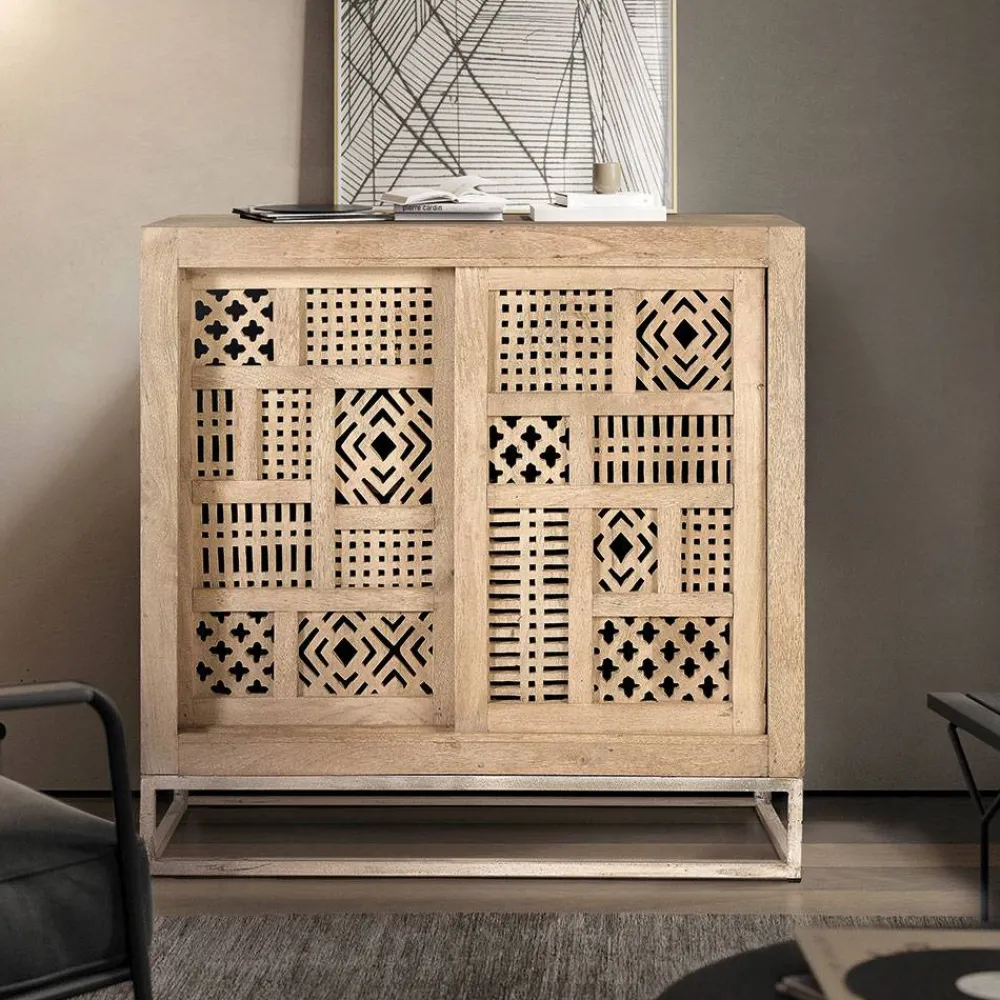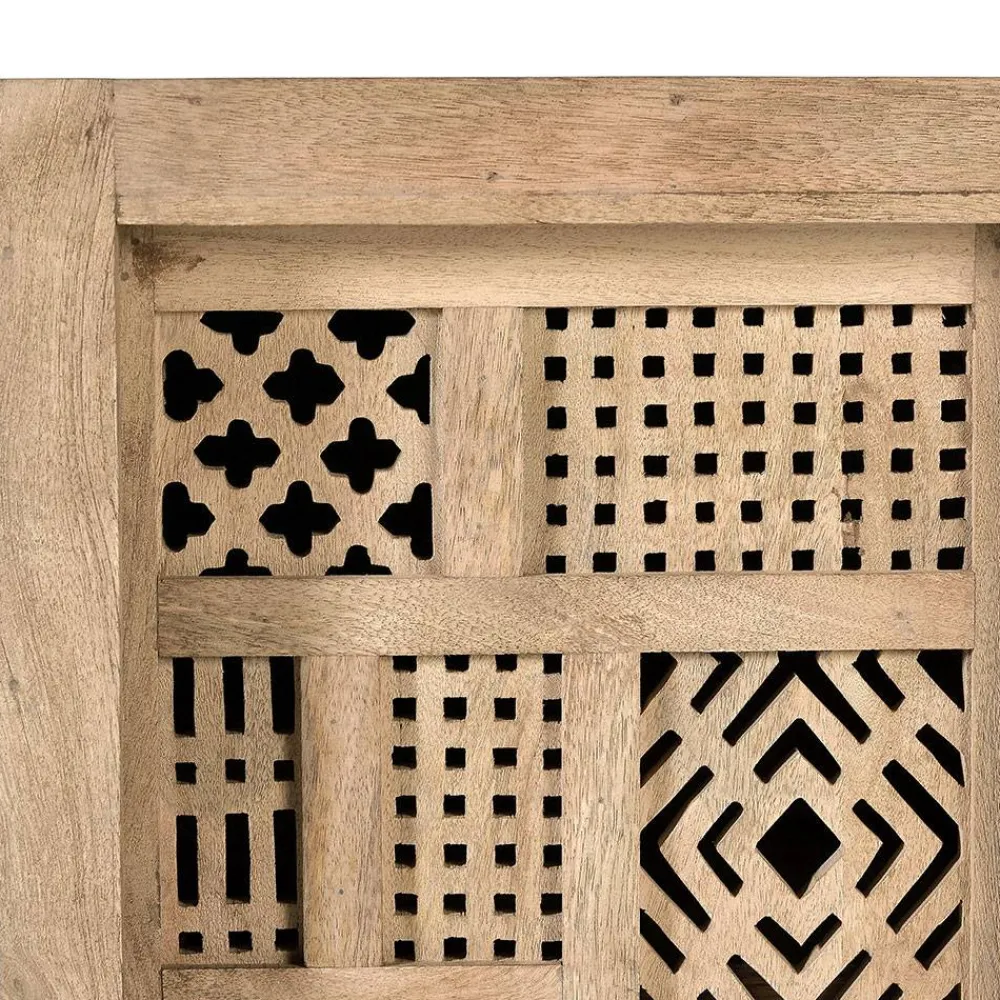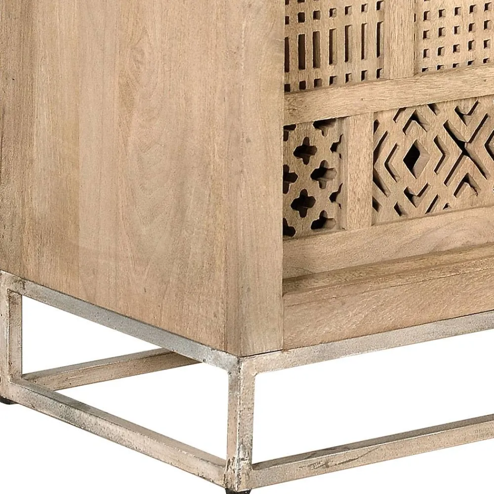 Die Kommode besteht aus massivem Mangoholz, das nicht nur durch seine außergewöhnliche Maserung überzeugt, sondern auch besonders robust und langlebig ist. Die Oberfläche wurde liebevoll von Hand bearbeitet, wodurch jedes Stück zu einem Unikat wird. Farblich abgestimmte Metallbügel bilden das stabile Untergestell und sorgen für sicheren Stand. Die Front ist ein wahres Kunstwerk: Aufwendig geschnitzte Muster und dekorative Durchbrüche verleihen der Kommode ihren unvergleichlichen Charakter.