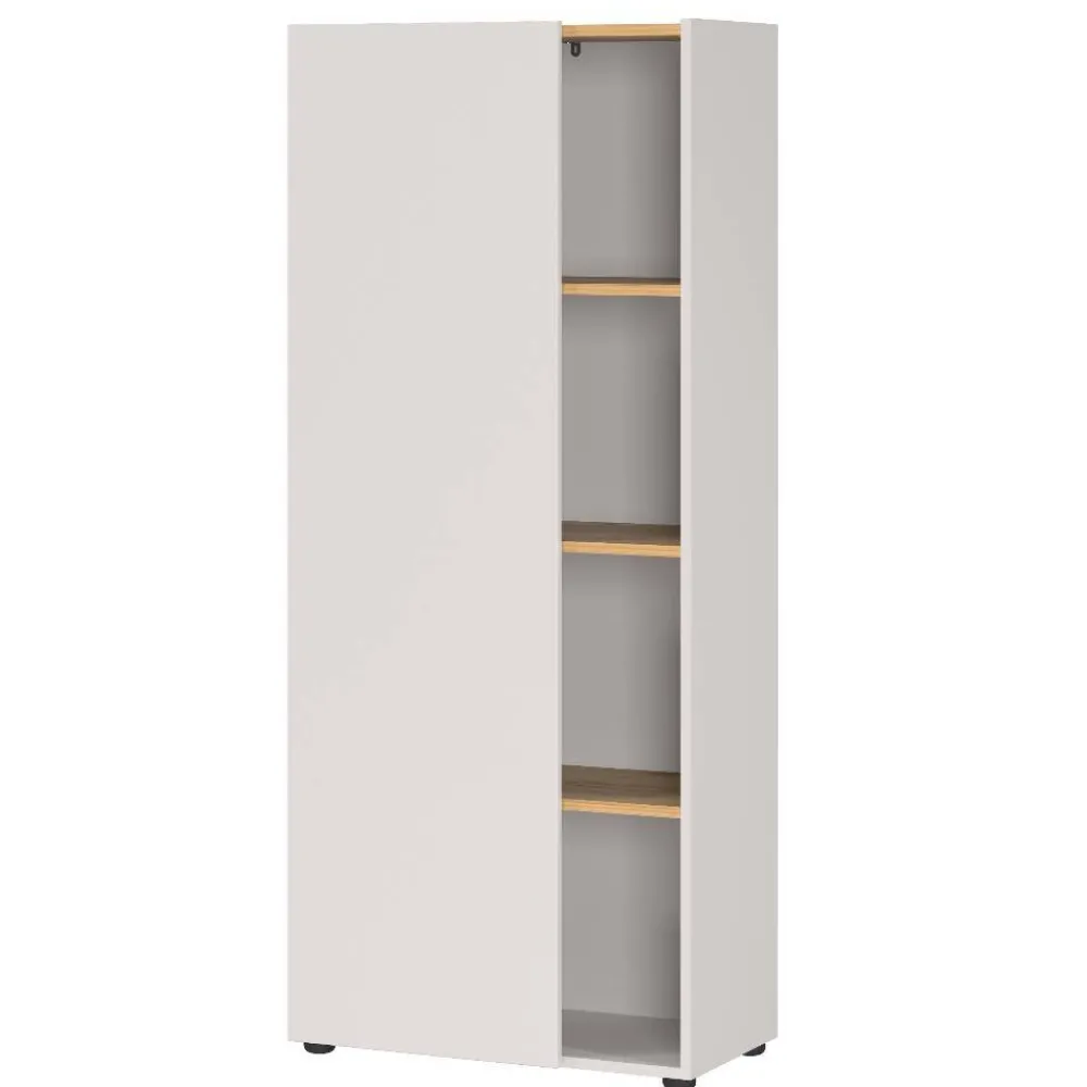 Der Türanschlag ist wahlweise rechts oder links montierbar, sodass sich der Schrank perfekt an die räumlichen Gegebenheiten anpassen lässt. Die stabilen Kunststoff-Bodengleiter schützen empfindliche Böden und sorgen für sicheren Stand. Für zusätzliche Sicherheit ist eine Kippsicherung zur Wandmontage enthalten.