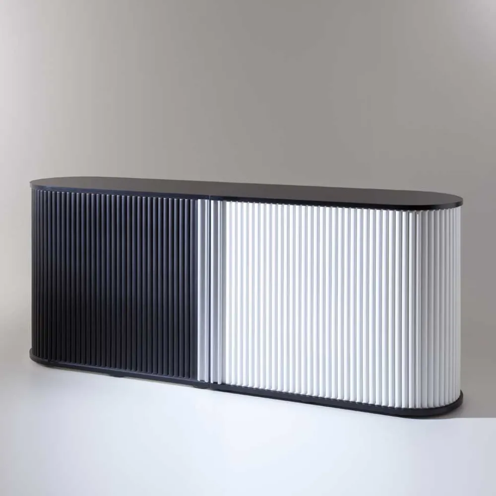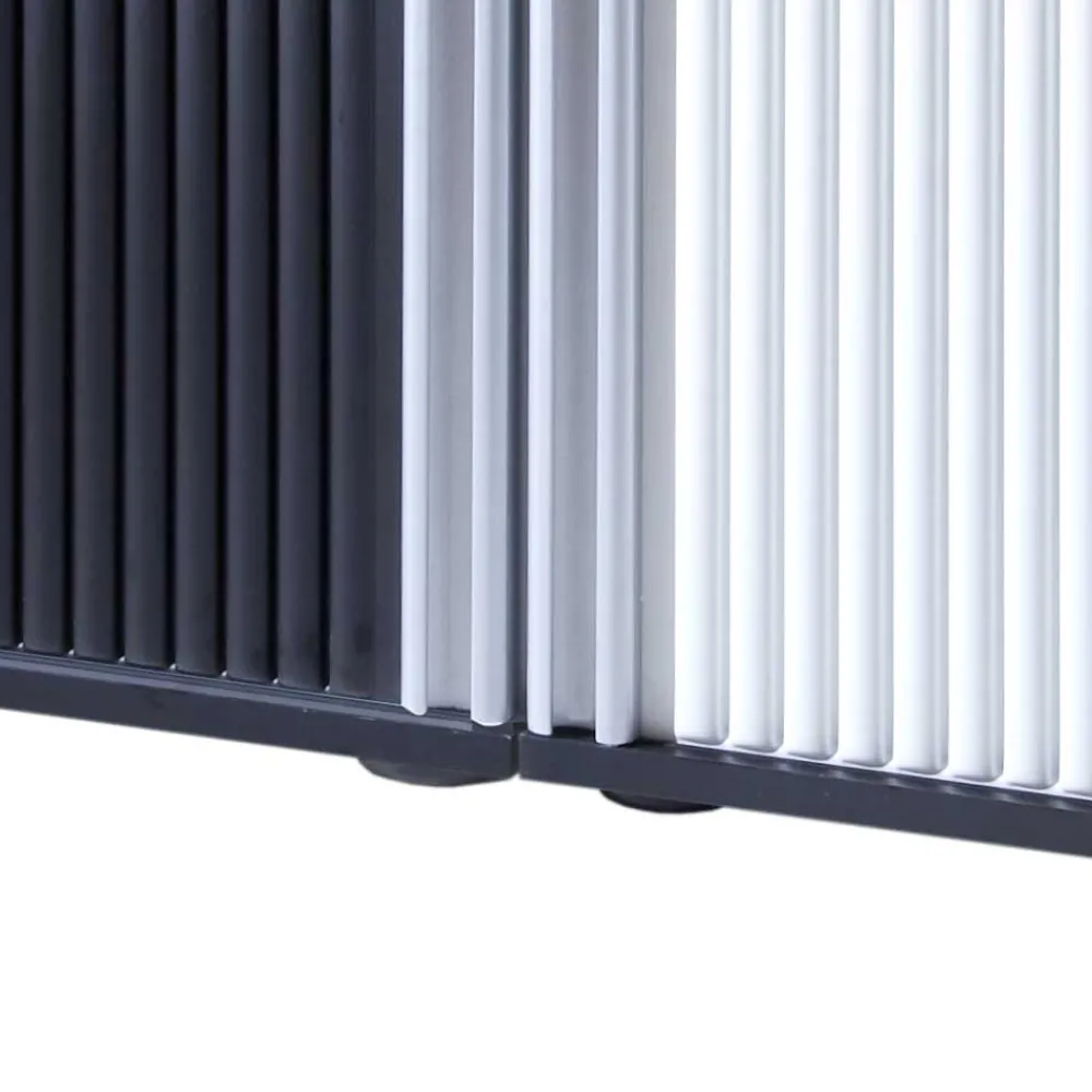 Mit einer Breite von 196 cm, einer Höhe von 82 cm und einer Tiefe von 45 cm bietet dieser Schrank jede Menge Stauraum – perfekt für alles, was geordnet und griffbereit verstaut werden soll. Zwei nebeneinander stehende Schränke bilden die Basis des Möbels und sorgen für ein besonders harmonisches Gesamtbild. Hinter den beiden Jalousie-Türen in elegantem Schwarz und Weiß, die sich ganz leicht per eloxierter Aluminium-Griffleiste auf- und zuziehen lassen, verbirgt sich jeweils ein großzügiger Fachboden mit Ordnerhöhe. Damit eignet sich „Siparia“ hervorragend zur Aufbewahrung von Akten, Haushaltsutensilien, Technik oder Alltagsgegenständen – je nachdem, wie Sie ihn einsetzen möchten.