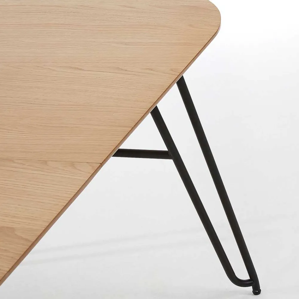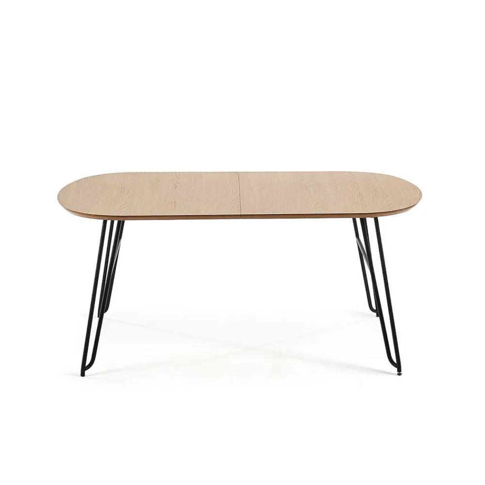 Die ovale Tischplatte aus hochwertigem MDF ist mit einem edlen Eiche Echtholzfurnier versehen und lackiert – für eine angenehme Haptik und langlebigen Schutz. Die etwa 2,5 cm starke Platte wirkt durch ihre aufwendig abgeschrägten Kanten filigran und modern zugleich. Getragen wird sie von einem markanten, aber dennoch dezenten Stahlgestell in schwarzer Haarnadelform. Diese Konstruktion ist nicht nur ein echter Hingucker, sondern auch durch zusätzliche Verstärkungen äußerst stabil – bei einer Belastbarkeit von bis zu 75 kg.