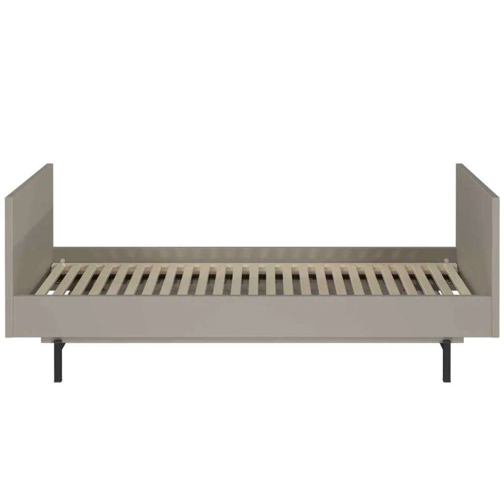 Das Kinderbett bietet mit seiner Liegefläche von 70 x 140 cm eine komfortable Schlafstätte für die ersten Jahre. Die Seiten sind mit robusten Gitterleisten ausgestattet, die Geborgenheit und Schutz bieten. Besonders praktisch: Drei sogenannte Schlupfsprossen lassen sich bei Bedarf entfernen, sodass Ihr Kind selbstständig in sein Bett hinein- und hinausgelangen kann. Der mitgelieferte Lattenrost aus unbehandeltem Massivholz lässt sich auf drei Höhen einlegen – von rückenschonend bis sicher für mobile Kleinkinder. Belastbar ist das Bett bis zu 100 kg, und mit den beiliegenden Umbauseiten wird es im Handumdrehen zum Juniorbett für die Zeit bis ins Grundschulalter. Die Füße aus schwarz pulverbeschichtetem Metall runden das Design stilvoll ab – mit 11 cm Bodenfreiheit für leichte Reinigung inklusive.