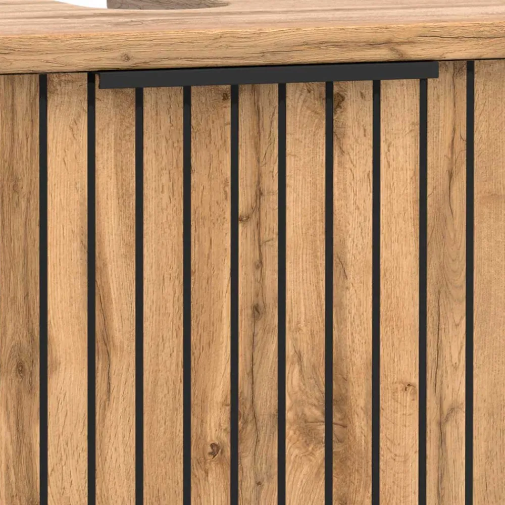 Gefertigt aus robuster Spanplatte, bietet dieser Waschbeckenunterschrank eine solide und langlebige Basis. Die pflegeleichte Oberfläche ist melaminbeschichtet in authentischer Holzoptik Wildeiche – eine Beschichtung, die nicht nur täuschend echt aussieht, sondern auch schützt: vor Feuchtigkeit, Kratzern und Alltagsbeanspruchung. Die Front überzeugt durch ihre spannende Rillenstruktur, die mit schwarzer Folie hinterlegt ist und dem Möbel Charakter und Tiefe verleiht. Ein echtes Highlight ist die Deckplatte mit einer Stärke von ca. 2,5 cm, die sich optisch wie haptisch massiv und wertig anfühlt.