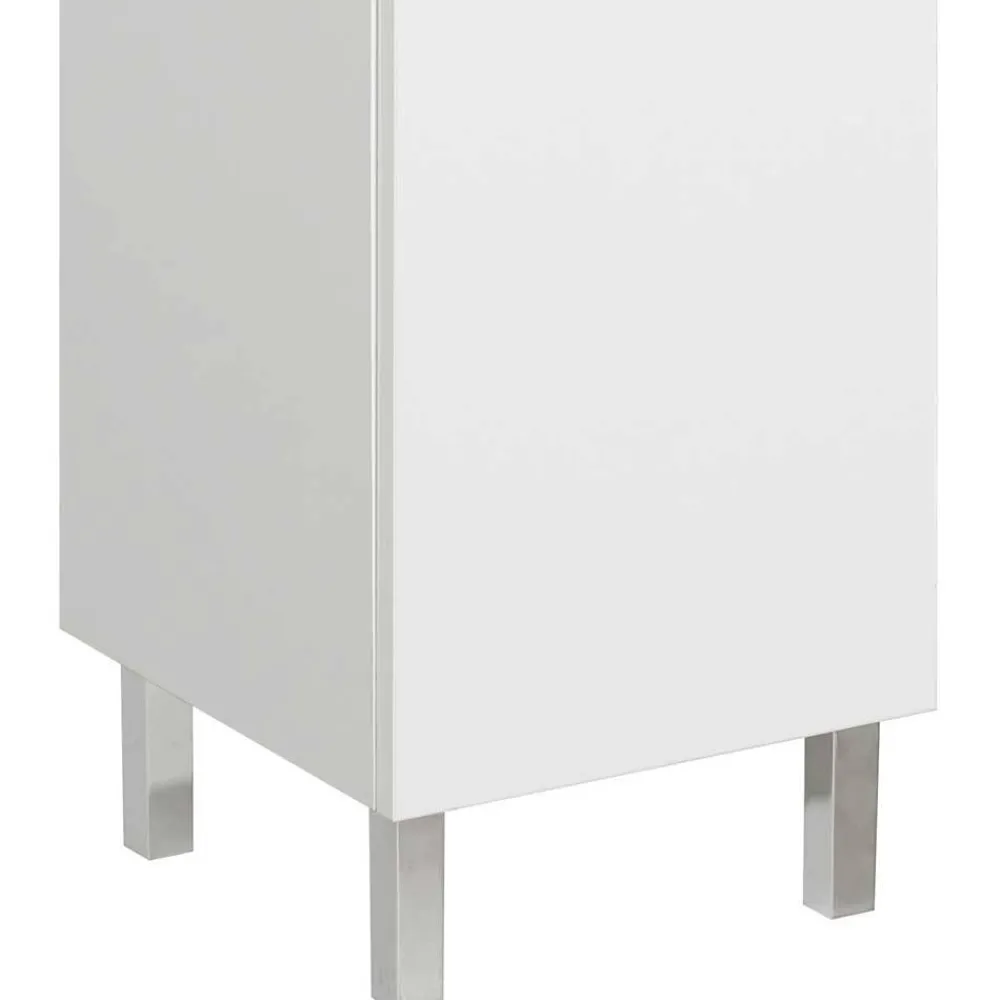 Der Unterschrank „Ardin“ ist aus strapazierfähiger Spanplatte gefertigt und melaminbeschichtet, wodurch er nicht nur pflegeleicht, sondern auch besonders widerstandsfähig ist. Die glänzende Front verleiht dem Möbelstück eine moderne Ausstrahlung, während die robusten ABS-Kanten dafür sorgen, dass der Schrank auch nach Jahren noch wie neu aussieht. Die Griffe und Füße in Chromoptik setzen dezente, aber elegante Akzente und fügen sich harmonisch in das Gesamtbild ein.