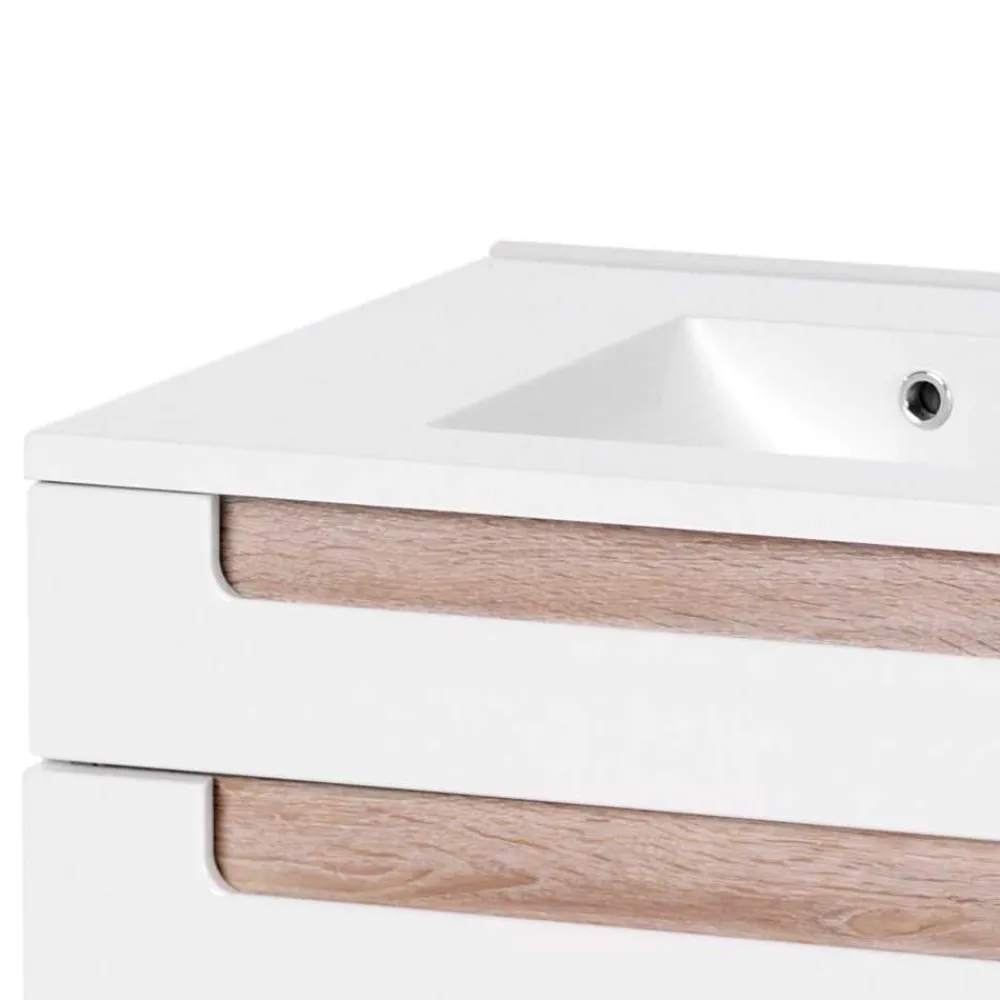 - Weiß lackierter Unterbeckenschrank mit eichefarbigen Griffmulden