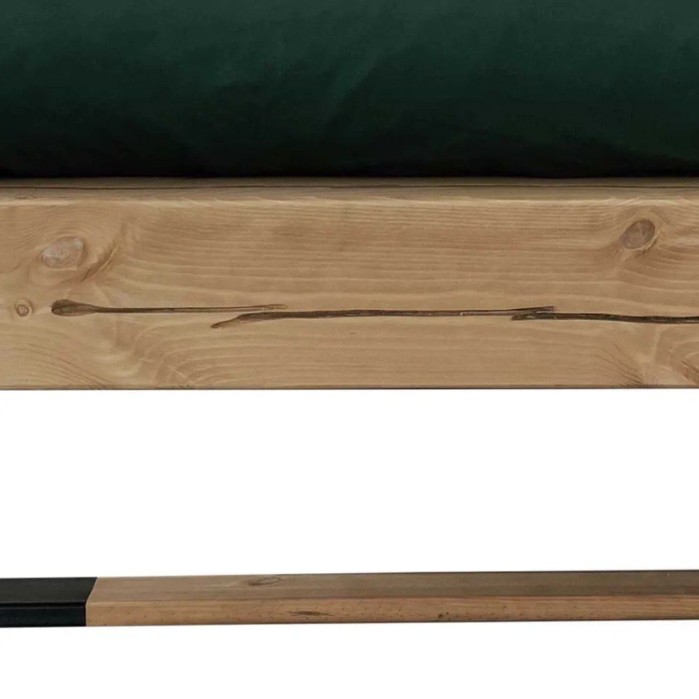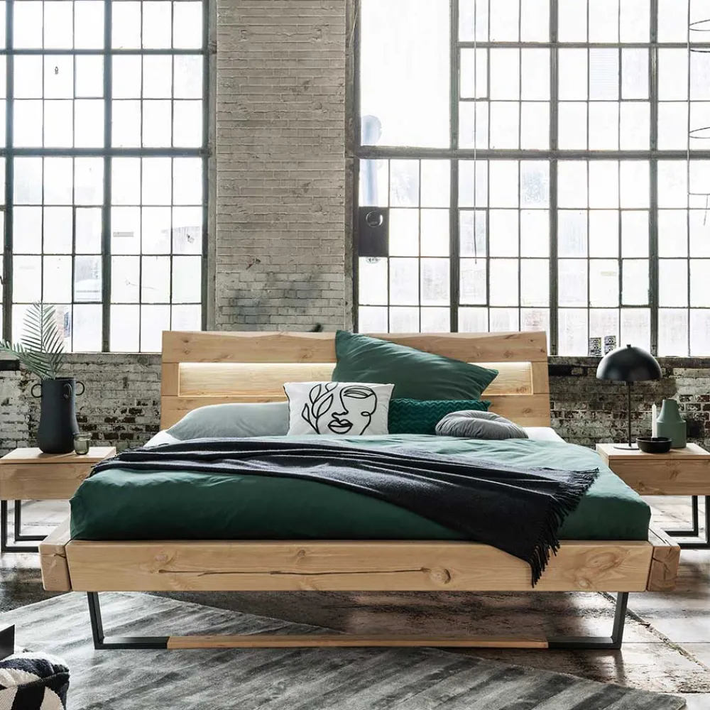 Das Bügelgestell aus Metall mit dekorativen Holz Inlays verleiht dem Bett zusätzliche Raffinesse. Holzoberflächen sind natürlich geölt, während die Metallelemente in Schwarz pulverbeschichtet sind. Astlöcher, Unebenheiten und Wuchsrisse werden bewusst betont, um den rustikalen Charme zu unterstreichen.