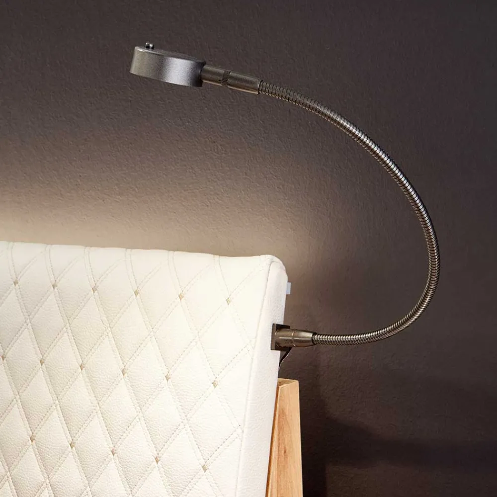 Die zwei LED-Flexleuchten in moderner Schiefer-Optik sind direkt am Kopfteil befestigt. Sie bieten punktgenaues Licht, das individuell ausgerichtet werden kann – perfekt als Leselicht oder dezente Beleuchtung für gemütliche Abendstunden.