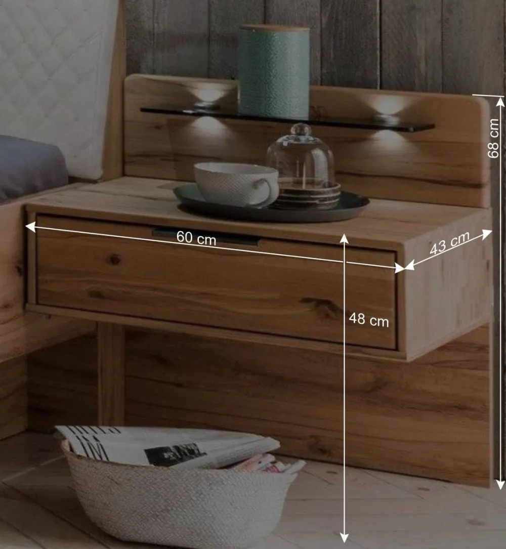 Ein weiteres Highlight ist das aufgesetzte Wandpaneel mit edlem Rauchglasboden und LED-Touch-Beleuchtung, das eine stimmungsvolle Atmosphäre in Ihrem Schlafzimmer schafft. Dezente, pulverbeschichtete Metall-Kantengriffe in Dunkelgrau runden das moderne Design harmonisch ab. Die Kommoden lassen sich einfach am Bett montieren und sorgen durch ihre schwebende Optik für ein elegantes Gesamtbild.
