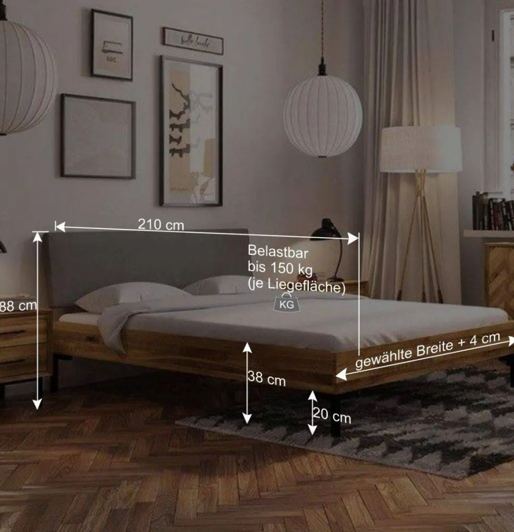 Wohnen Bett mit Wildeiche Rahmen & Polsterkopfteil in Grau – Kerfa