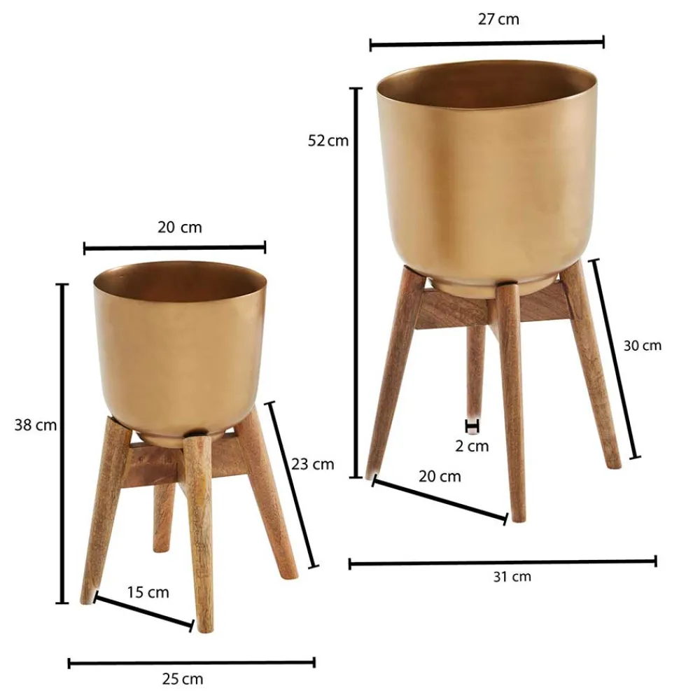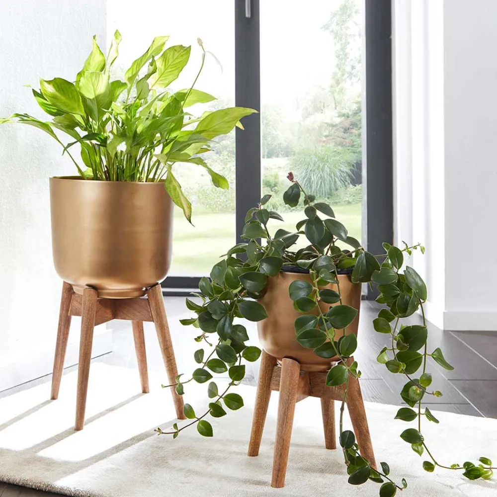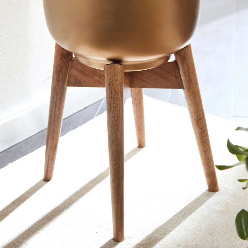 Die Kübel bestehen aus lackiertem Metall in elegantem Goldton und lassen sich praktisch abnehmen. Das stabile Gestell aus massivem Mangobaumholz sorgt für sicheren Halt und ist mit Filzgleitern ausgestattet, um empfindliche Böden zu schützen.