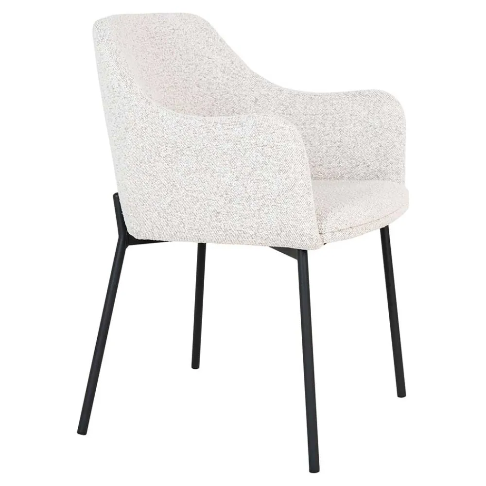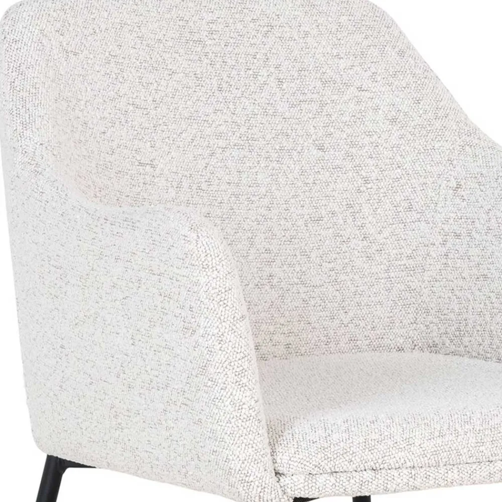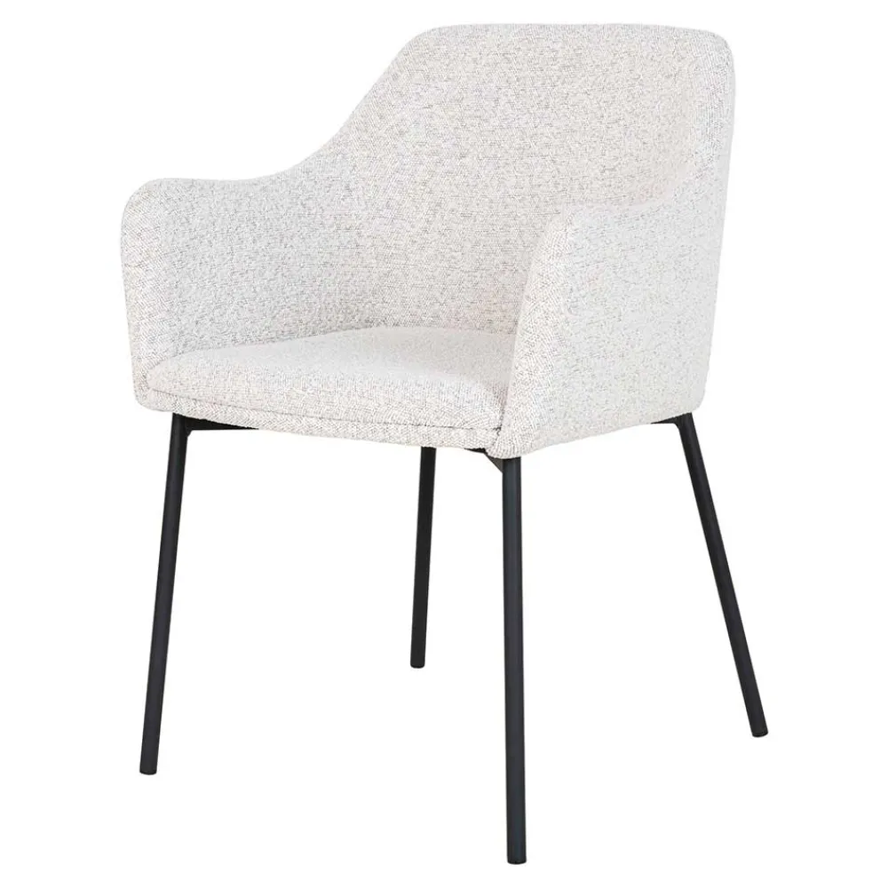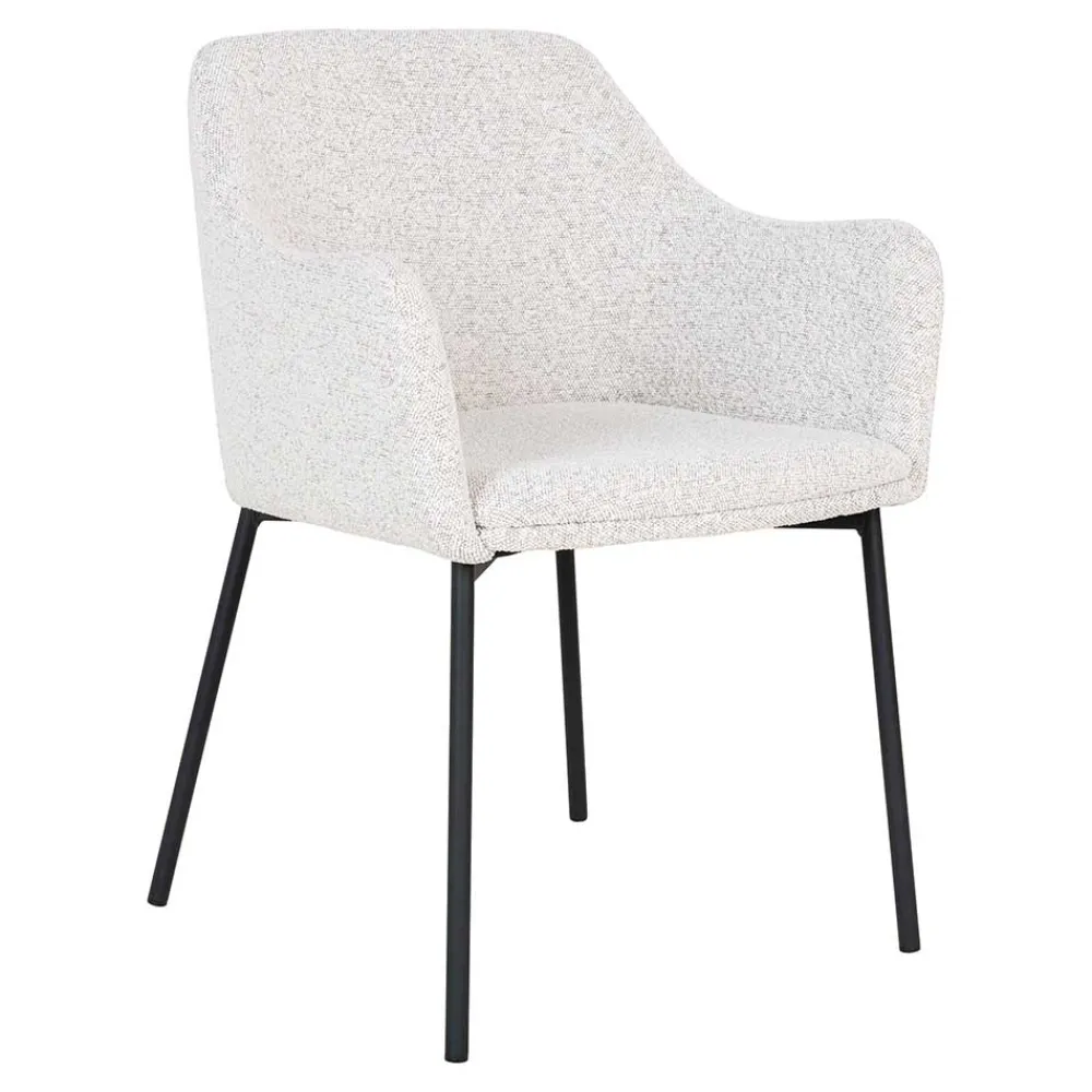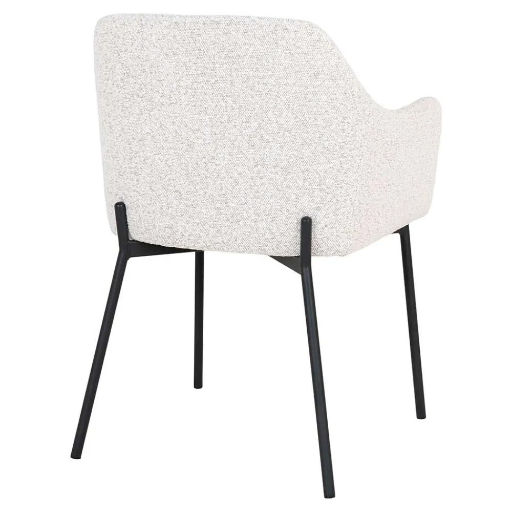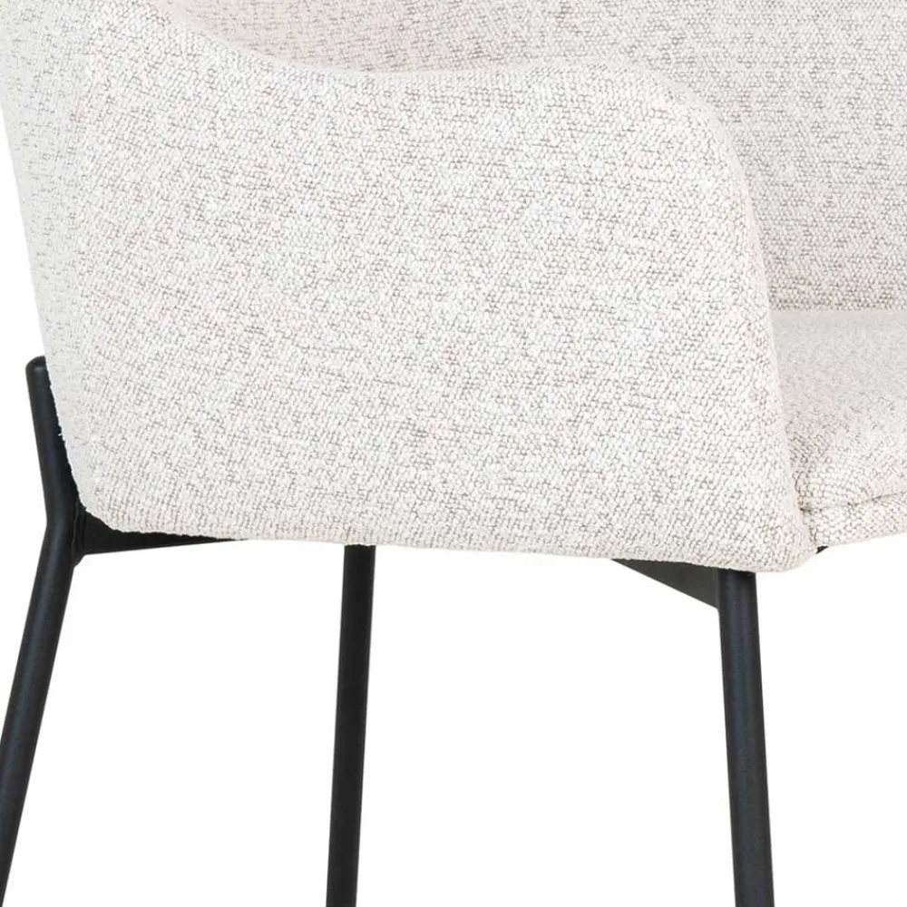 Der Bezug des Stuhls besteht aus Boucle-Stoff, einem Material aus 100 % Polyester, das nicht nur angenehm weich, sondern auch pflegeleicht ist. Die Schaumstoffpolsterung sorgt für ein komfortables Sitzgefühl, während die leicht geschwungenen Armlehnen zusätzlichen Halt bieten. Die Rückenlehne ist leicht nach hinten geneigt und garantiert so eine bequeme Sitzposition, die auch bei längeren Sitzzeiten für Entspannung sorgt.