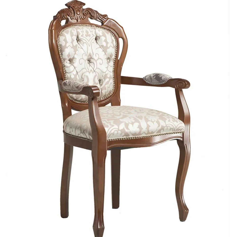 Jeder Aspekt des Stuhls „Pablos“ wurde sorgfältig durchdacht. Die opulent gestaltete Rückenlehne in Medaillonform mit reichen Schnitzereien setzt ein luxuriöses Statement. Die tiefen Steppungen, Nägel und bezogenen Zierknöpfe verleihen dem Stuhl zusätzliche Eleganz und raffinierte Details, die sicherlich alle Blicke auf sich ziehen werden.