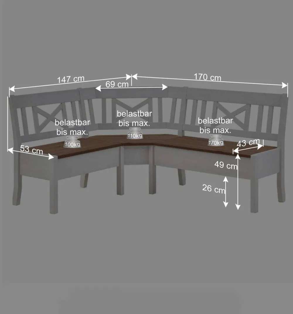 Die Eckbank „Barlad“ überzeugt mit einer stilvollen Rückenlehne, die durch senkrechte Streben und Kreuzelemente einen besonderen Akzent setzt. Das stabile Vierfußgestell sorgt für sicheren Stand und der Abstand von ca. 26 cm vom Boden bis zur Unterkante der Bank ermöglicht eine gute Luftzirkulation und erleichtert das Wischen darunter. Dank der hohen Belastbarkeit von 170 kg für den langen Schenkel, 100 kg für den kurzen Schenkel und 110 kg für das Eckelement ist die Bank äußerst robust und langlebig.