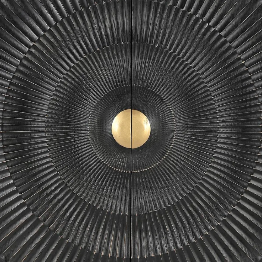 Im Zentrum des Designs steht das kunstvoll geschnitzte Mandala-Motiv auf der Front – ein Symbol für Harmonie, Balance und den inneren Kreis. Die plastische Tiefe dieses handgearbeiteten Musters bringt Bewegung und Leben in das Möbelstück und macht es zu einem echten Eyecatcher in jedem Wohnbereich. Geschlossen ergeben die beiden goldfarbenen Metallgriffe einen perfekten Kreis – ein stilistisches Detail, das nicht nur edel aussieht, sondern auch ein Gefühl von Vollkommenheit vermittelt.
