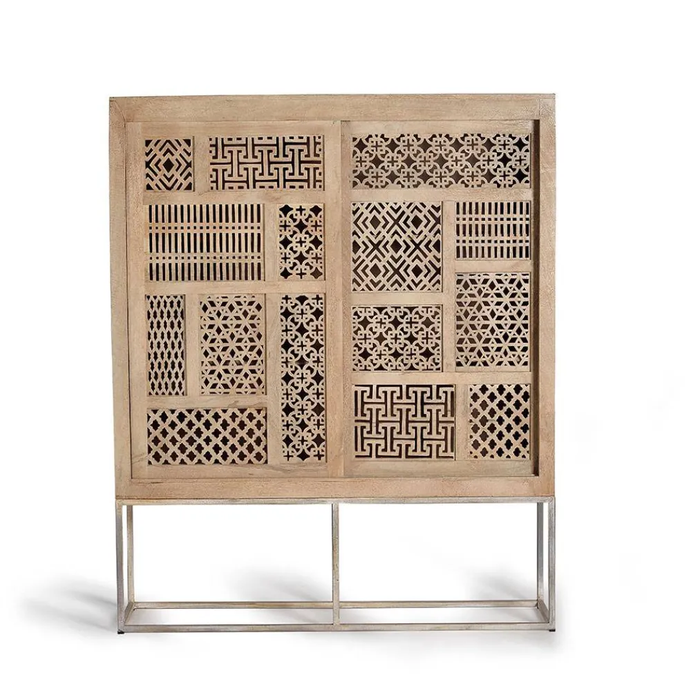 Verleihen Sie Ihrem Raum eine ganz besondere Note mit dem Design Schrank „Valuta“. Dieser außergewöhnliche Schrank beeindruckt nicht nur durch seine moderne Ästhetik, sondern auch durch die gelungene Kombination von natürlichen Materialien und sorgfältiger Handwerkskunst. Aus hochwertigem Mangoholz gefertigt, strahlt der Schrank eine warme, natürliche Schönheit aus, die sich perfekt in jedes moderne Wohnambiente einfügt. Mit seiner auffälligen Optik im Ethno Chic, wird dieser Schrank garantiert zum Blickfang in Ihrem Wohnzimmer, Schlafzimmer oder Flur.