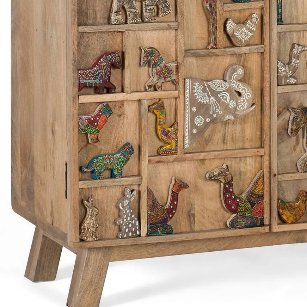 Der Schrank „Widama“ überzeugt durch hochwertiges Mangoholz, das für seine robuste Beschaffenheit und ausdrucksstarke Maserung geschätzt wird. Jedes Möbelstück ist aufgrund der natürlichen Farb- und Strukturunterschiede sowie der handwerklichen Verarbeitung ein echtes Unikat. Die lebendige Holzstruktur verleiht dem Möbel Wärme und eine organische Ausstrahlung, während die kunstvoll geschnitzten Tiermotive für einen verspielten und zugleich künstlerischen Look sorgen.