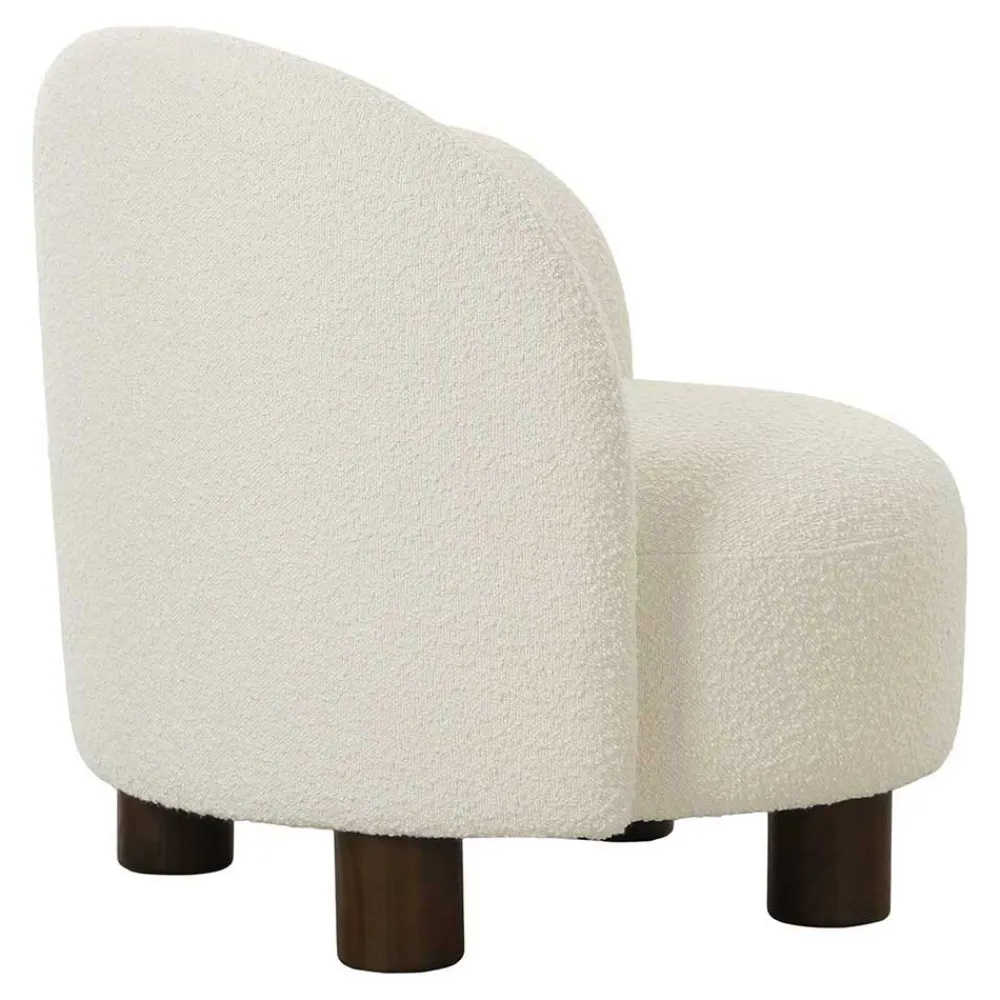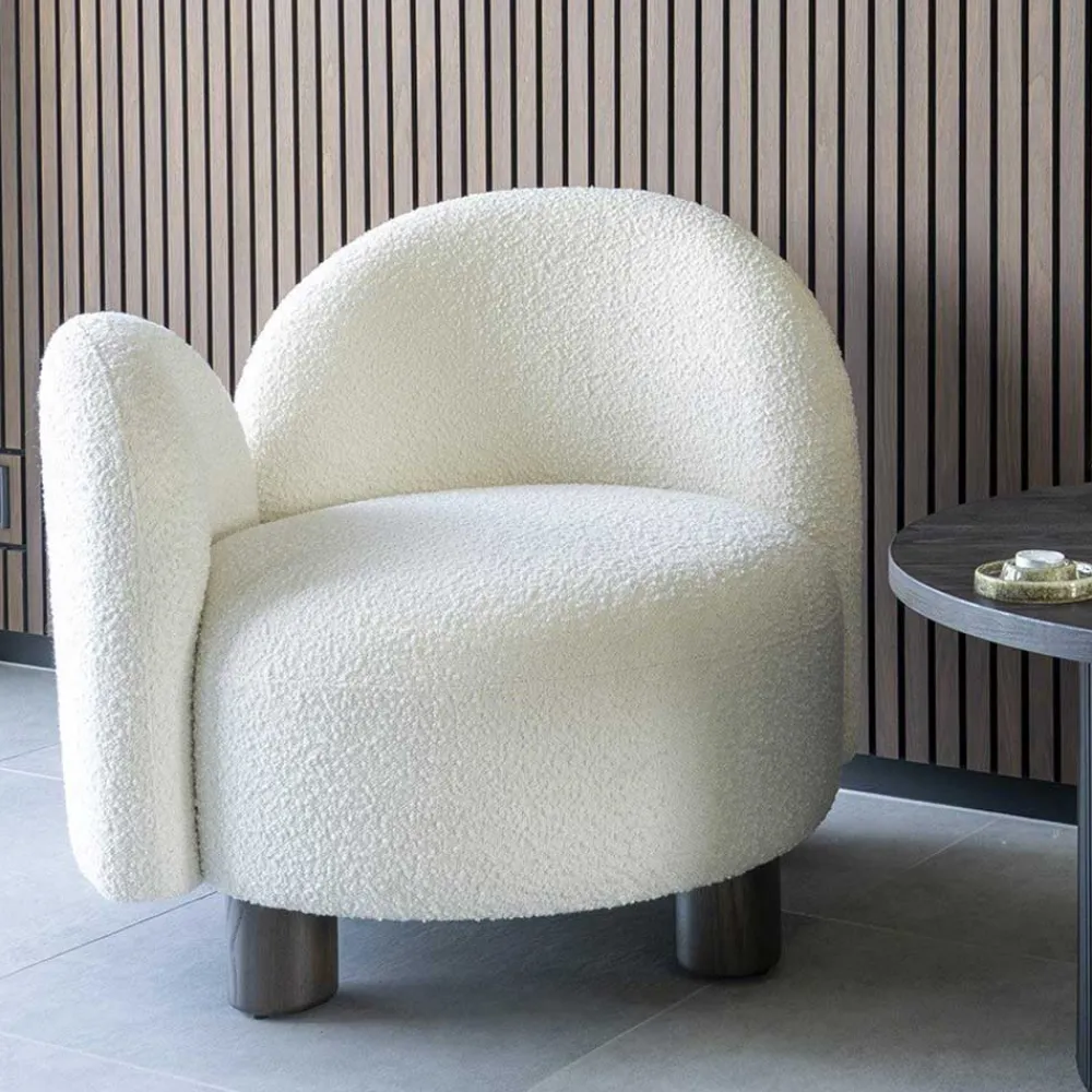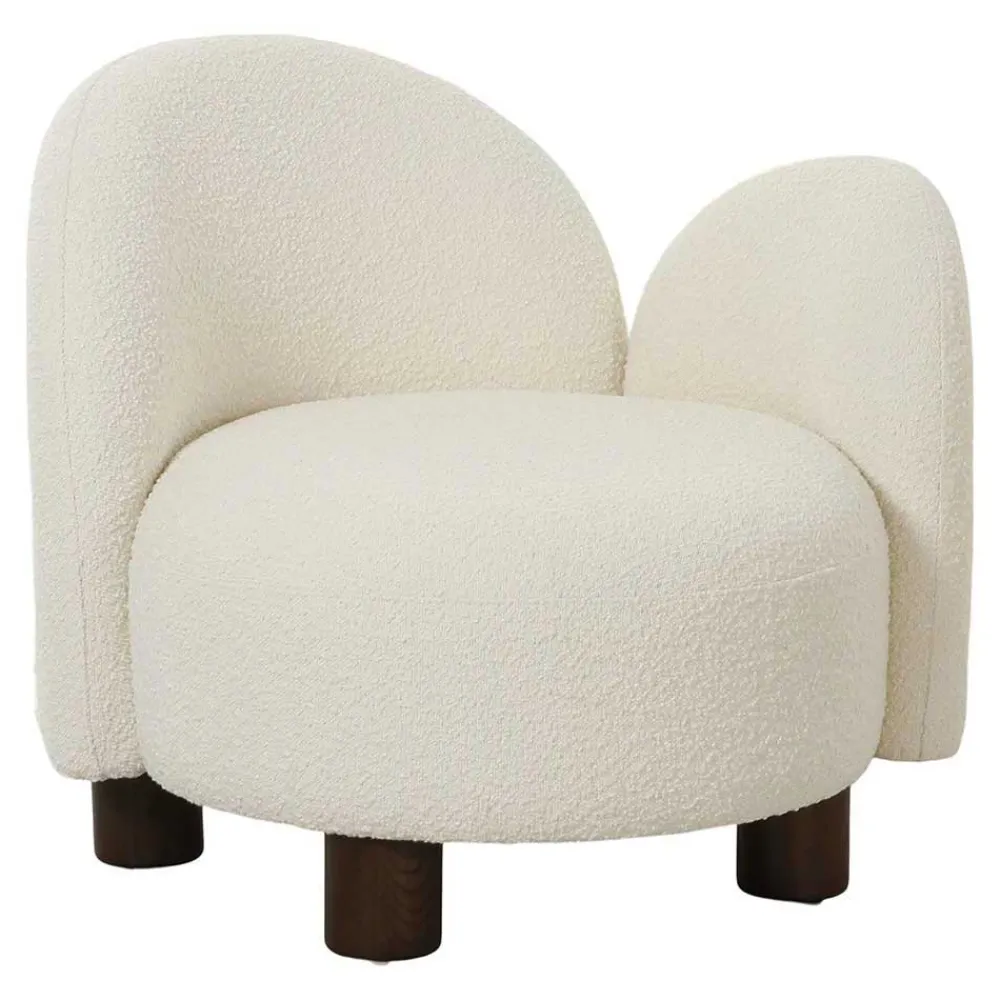 Der Designsessel „Cisterna“ ist aus erstklassigen Materialien gefertigt, die nicht nur durch ihre Optik, sondern auch durch ihre Haptik überzeugen. Der Bezug aus pflegeleichtem Boucle-Stoff (100 % Polyester) bietet eine weiche und angenehme Oberfläche, während die Schaumstoffpolsterung für einen außergewöhnlich hohen Sitzkomfort sorgt. Die Unterkonstruktion besteht aus robustem Holzwerkstoff, und die vier zylindrisch geformten Füße aus dunkelbraun lackiertem Eschenholz garantieren einen stabilen Stand. Die Verwendung von Esche Massivholz für die Füße verleiht dem Sessel zudem eine besondere Langlebigkeit und edle Note.