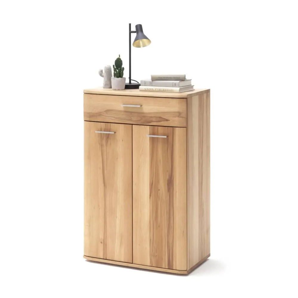 - Teilmassiv aus Kernbuche Massivholz (Front), Spanplatte (Korpus) und Spiegelglas gefertigt