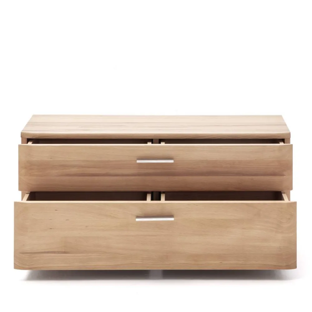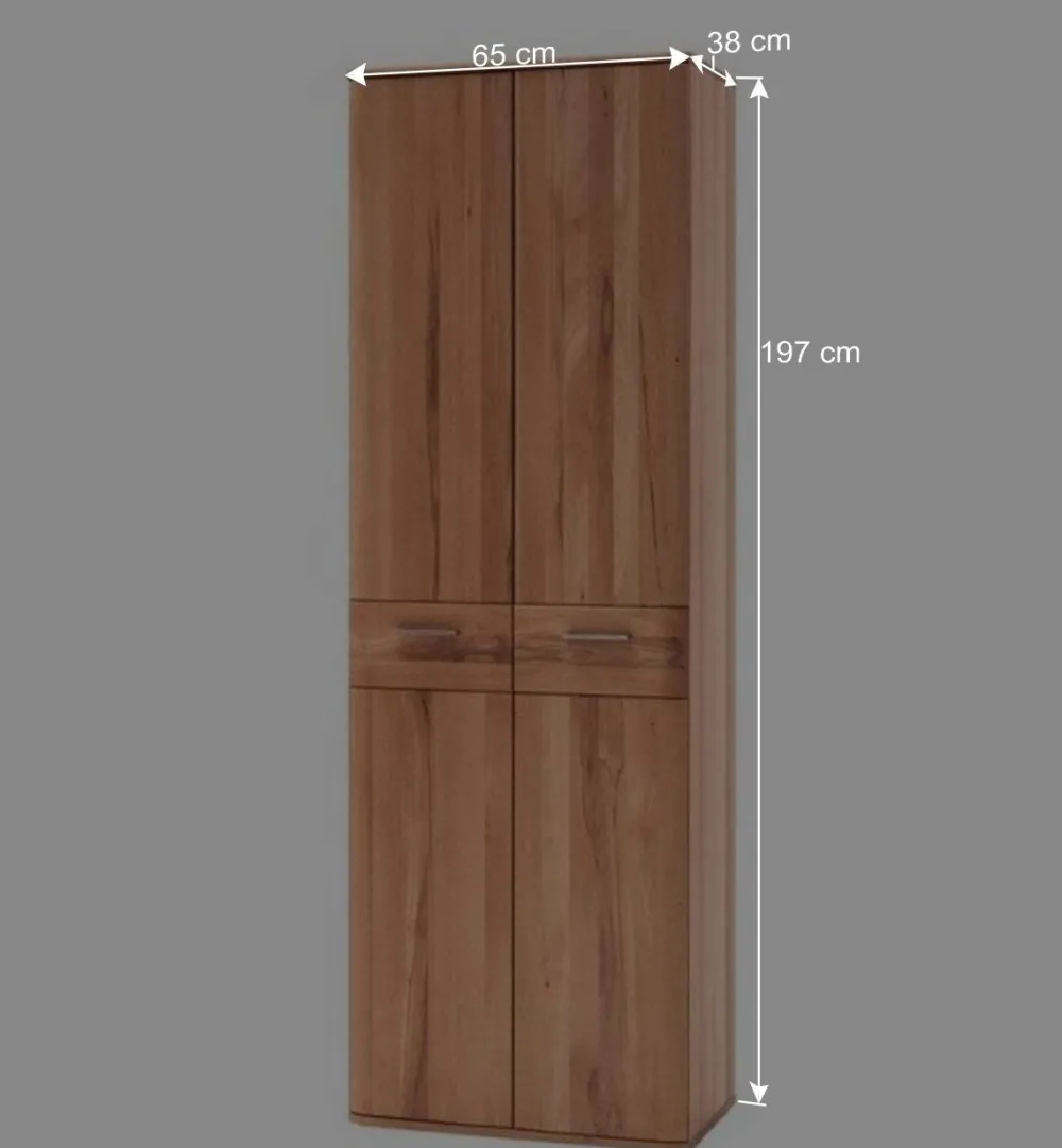 Das teilmassive Set kombiniert Kernbuche Massivholz (Front) mit echtholzfurnierten Spanplatten (Korpus) und Spiegelglas. Alle Holzoberflächen sind geölt, was die natürliche Struktur hervorhebt und für einen edlen Look sorgt. Silberfarbige Metall-Griffleisten und hochwertige Metallbeschläge runden das elegante Design ab.
