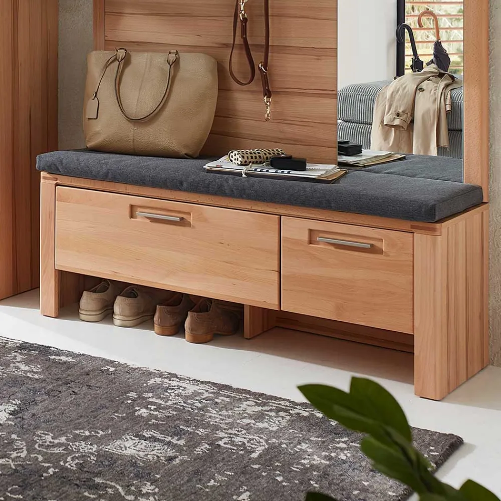 Die robuste Wangenkonstruktion aus Massivholz garantiert einen sicheren Stand. Unterhalb der Sitzfläche befindet sich ein Fach mit Klappe, ideal für die Aufbewahrung von bis zu drei Paar Schuhen. Ein zusätzliches Türfach bietet weiteren Stauraum und ist dank Dämpfung besonders komfortabel in der Nutzung. Eine weiche Polsterauflage mit pflegeleichtem Webstoff-Bezug in Anthrazit sorgt für zusätzlichen Komfort.
