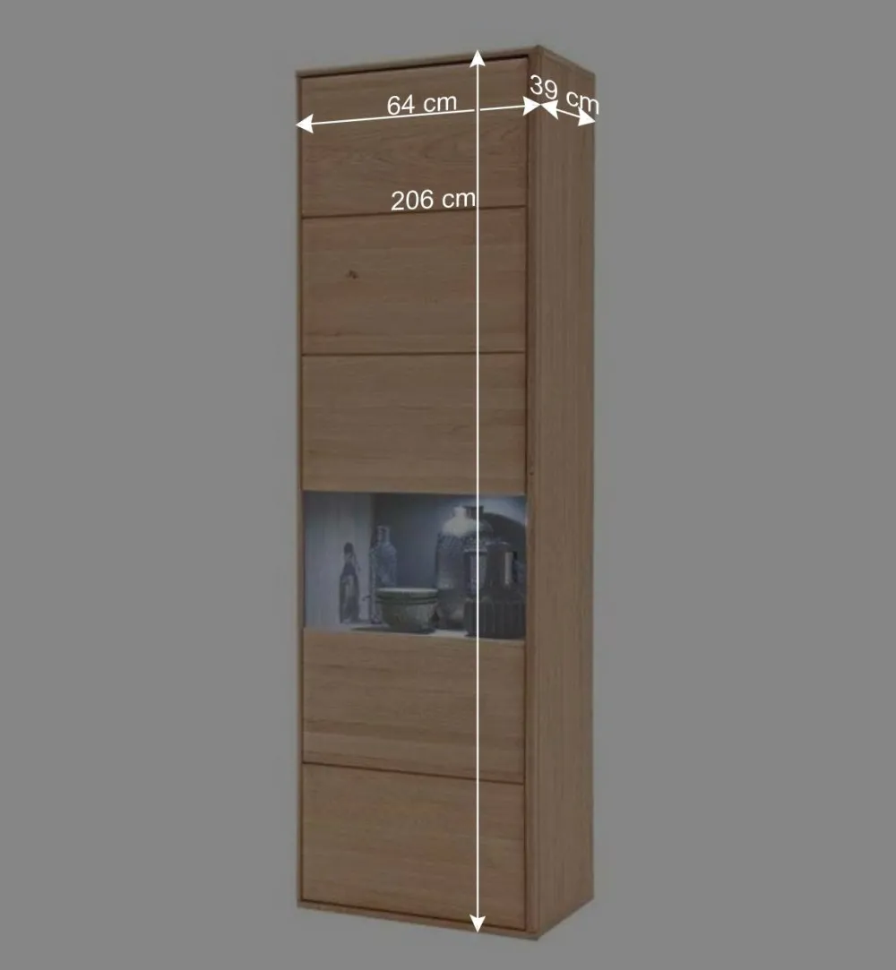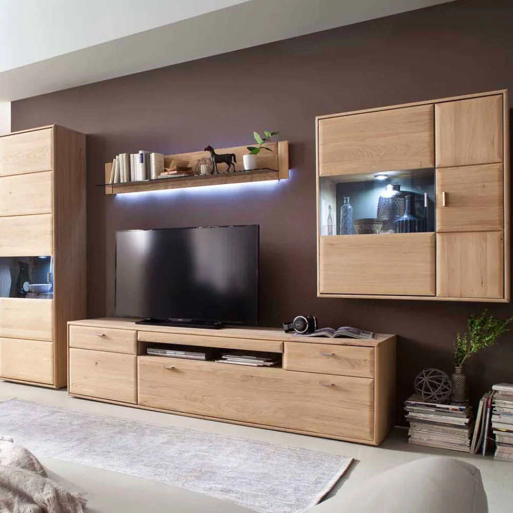 Die „Vernella“ Wohnwand besteht aus einer Vitrine, einem Hängeschrank, einem TV-Board und einem Wandboard. Die Fronten der Einzelteile sind aus massiver Eiche gefertigt, einem Holz, das für seine Robustheit, Langlebigkeit und unverwechselbare Maserung bekannt ist. Der Korpus ist aus hochwertiger MDF hergestellt, einem Material, das für seine glatte Oberfläche und Formstabilität geschätzt wird. Mit diesen Qualitätsmaterialien und einer sorgfältigen Verarbeitung ist die „Vernella“ Wohnwand ein Produkt, das lange hält und mit der Zeit noch schöner wird.