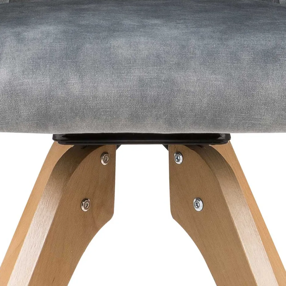 Das schräg gestellte Vierfußgestell aus massiver Buche, lackiert in warmen Eichefarben, garantiert Stabilität und eine harmonische Integration in jedes Raumkonzept. Die integrierte 180-Grad-Drehfunktion erhöht die Funktionalität des Stuhls, ermöglicht einfaches Hinsetzen und Aufstehen und fördert die Interaktion im Raum.