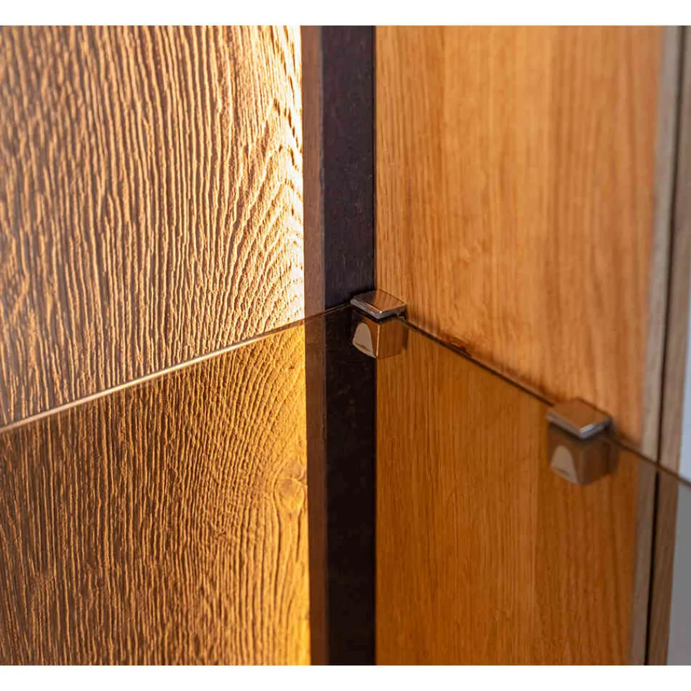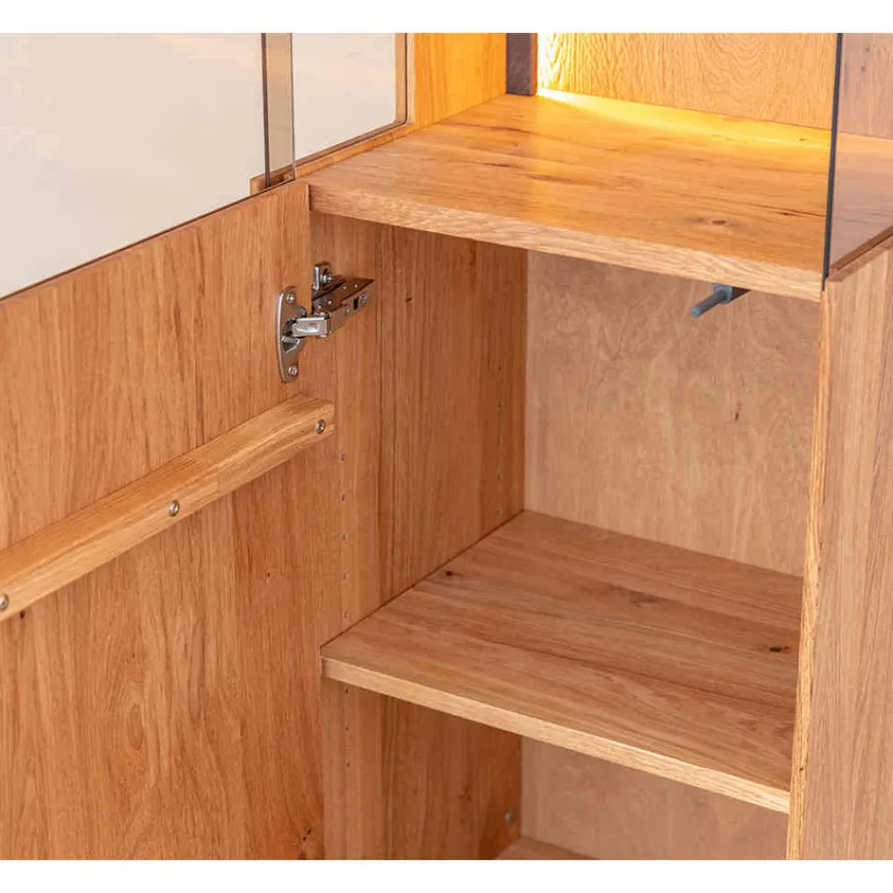 Hinter der Tür verbergen sich drei Holzeinlegeböden und zwei Glasböden, die ausreichend Platz für Bücher, Geschirr oder Dekorationsgegenstände bieten. Die indirekte LED-Beleuchtung mit sandgestrahlter Struktur der Rückwand sorgt für eine stimmungsvolle Atmosphäre und setzt Ihre Sammlerstücke gekonnt in Szene.
