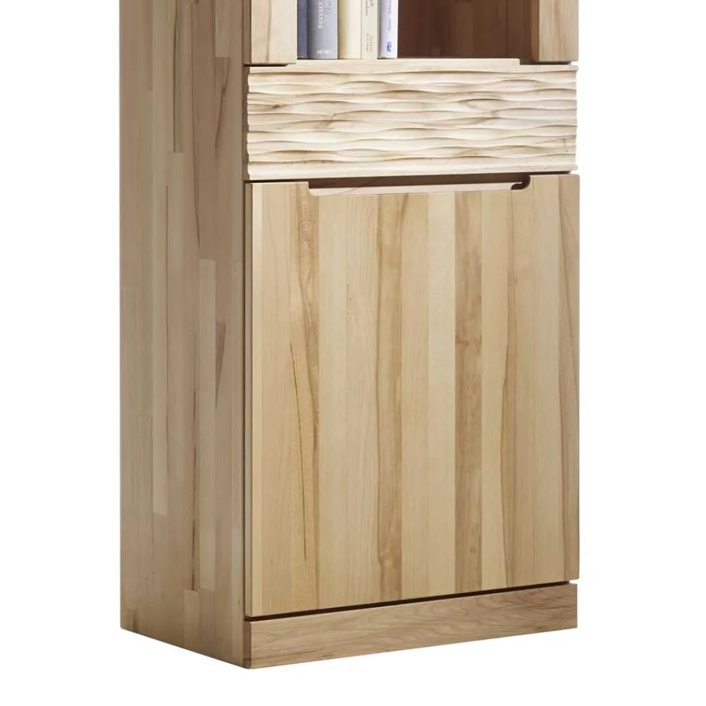 Das Massivholzregal Wahano besteht aus lebhaft gemaserter Kernbuche mit natürlich geölten Oberflächen. Während alle anderen Flächen des Möbelstücks glatt ausgeführt sind, ist die Schubladenfront geschroppt ausgeführt, wodurch die Erscheinung des Regals markant-interessanter wird.