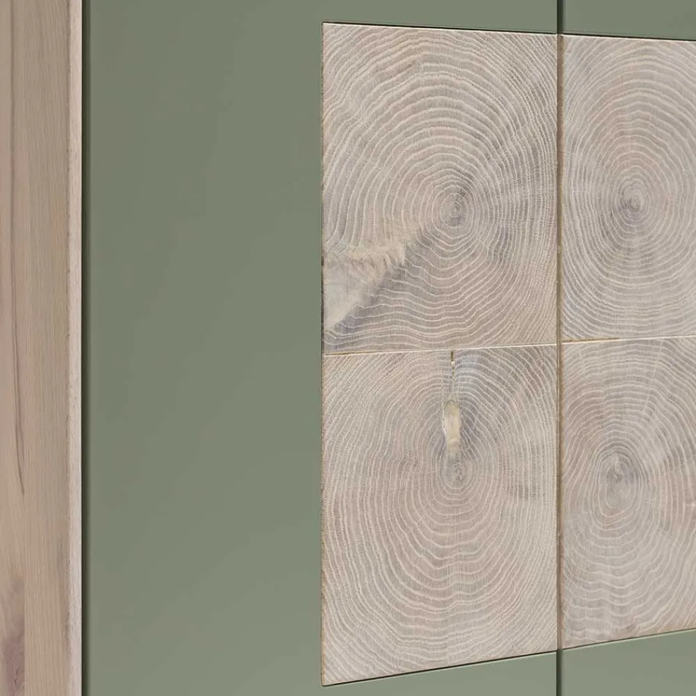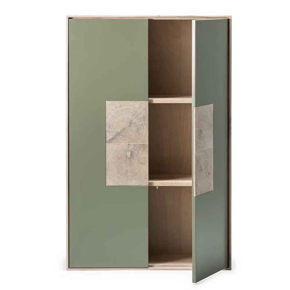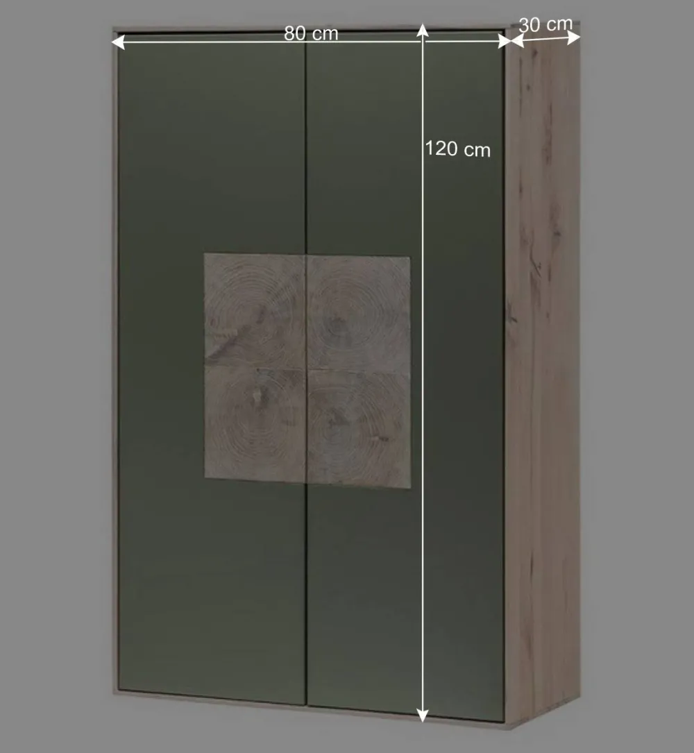 Mit Maßen von 80 cm in der Breite, 120 cm in der Höhe und 30 cm in der Tiefe bietet der „Ajevos“ Hängeschrank ausreichend Stauraum für Ihre persönlichen Gegenstände. Die beiden Drehtüren sind mit gedämpften Metallscharnieren ausgestattet und verfügen über eine Push-to-open Funktion, die ein sanftes Öffnen und Schließen ermöglicht – praktisch und grifflos zugleich. Die mittig verzierten Türfronten mit echten Hirnholz-Applikationen verleihen dem Schrank eine zusätzliche edle Note.