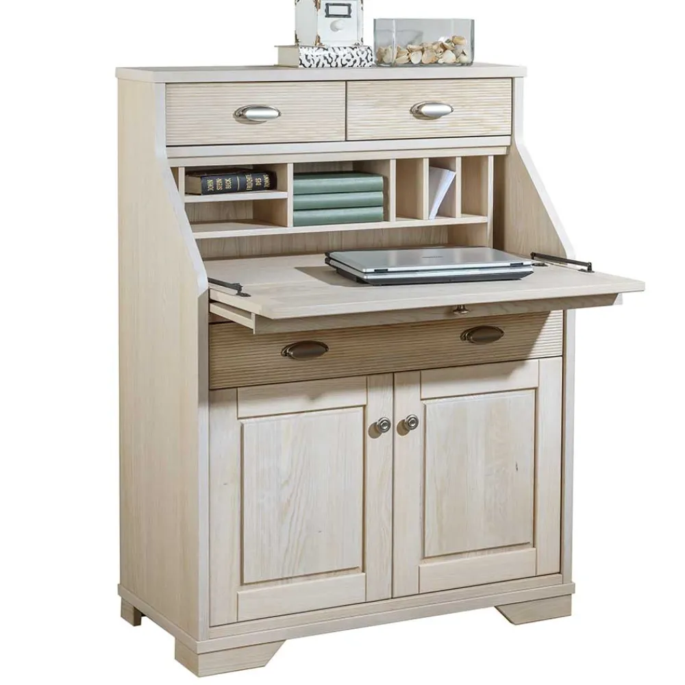Der Sekretär „Larioja“ zeichnet sich durch seinen formschönen Landhaus-Look aus, der jede Einrichtung mit einer Prise ländlicher Romantik bereichert. Der Stil zeugt von -einer leichten, luftigen Gestaltung mit sanften Farben und natürlichen Materialien, ideal, um eine warme, einladende Atmosphäre zu schaffen.