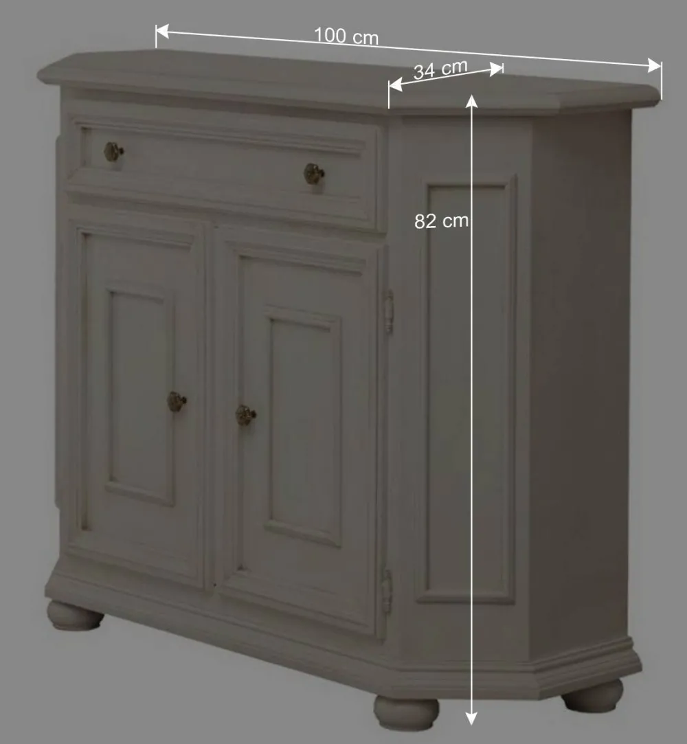 Mit einer Breite von 100 cm, einer Höhe von 82 cm und einer Tiefe von 34 cm passt die Kommode „Vicina“ ideal in jeden Eingangsbereich, Flur oder Garderobe. Die attraktive sechseckige Form, die vorne schmaler als hinten ist, macht sie zu einem echten Blickfang und verleiht jedem Raum eine besondere Note. Maßabweichungen können durch die handwerkliche Fertigung entstehen, was jede Kommode zu einem Unikat macht. Diese individuellen Unterschiede sind das Ergebnis sorgfältiger Handarbeit und verleihen jedem Stück seine eigene Persönlichkeit.