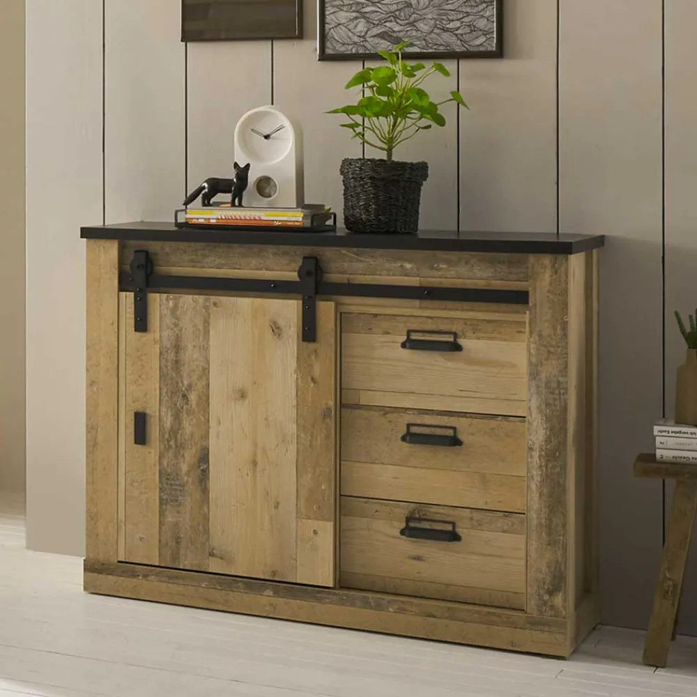 - Markante Kommode in Altholzoptik verwittert und Anthrazit