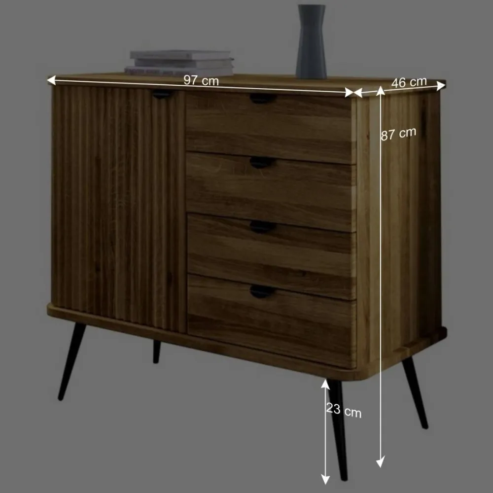 Die Kommode „Casarius“ bietet mit ihren Maßen von 97 cm Breite, 87 cm Höhe und 46 cm Tiefe viel Stauraum. Sie verfügt über eine Tür mit Soft Close Funktion, die für ein sanftes und leises Schließen sorgt. Die Türfront ist zudem mit einer aufwändig plastischen Rillenstruktur gestaltet, die dem Möbelstück eine zusätzliche visuelle Tiefe verleiht. Hinter der Tür verbirgt sich ein praktischer Einlegeboden.