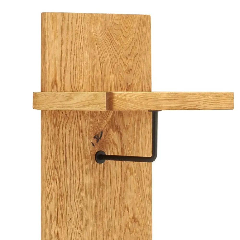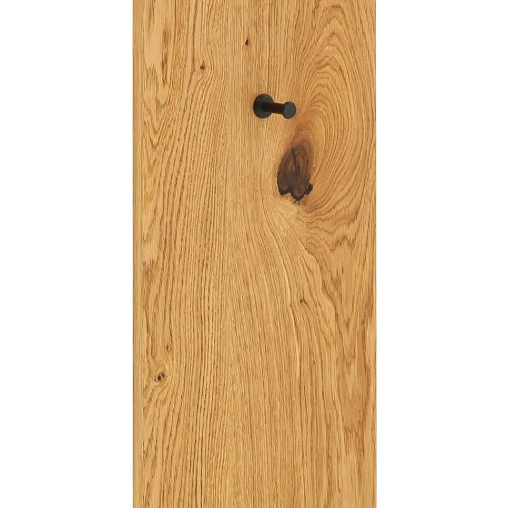 Die zwei Garderobenpaneele überzeugen mit ihrer kompakten Bauweise und durchdachten Ausstattung. Sie verfügen jeweils über einen oberen Hutboden, eine Kleiderstange aus pulverbeschichtetem Metall in Schwarzgrau sowie einen runden Kleiderhaken im unteren Bereich. Gefertigt aus Rückwänden mit Wildeiche Furnier und Blendleisten aus Balkeneiche Massivholz, punkten die Paneele mit ihrem natürlichen Design und ihrer Funktionalität. Jedes Paneel misst 30 cm Breite, 168 cm Höhe und 30 cm Tiefe.