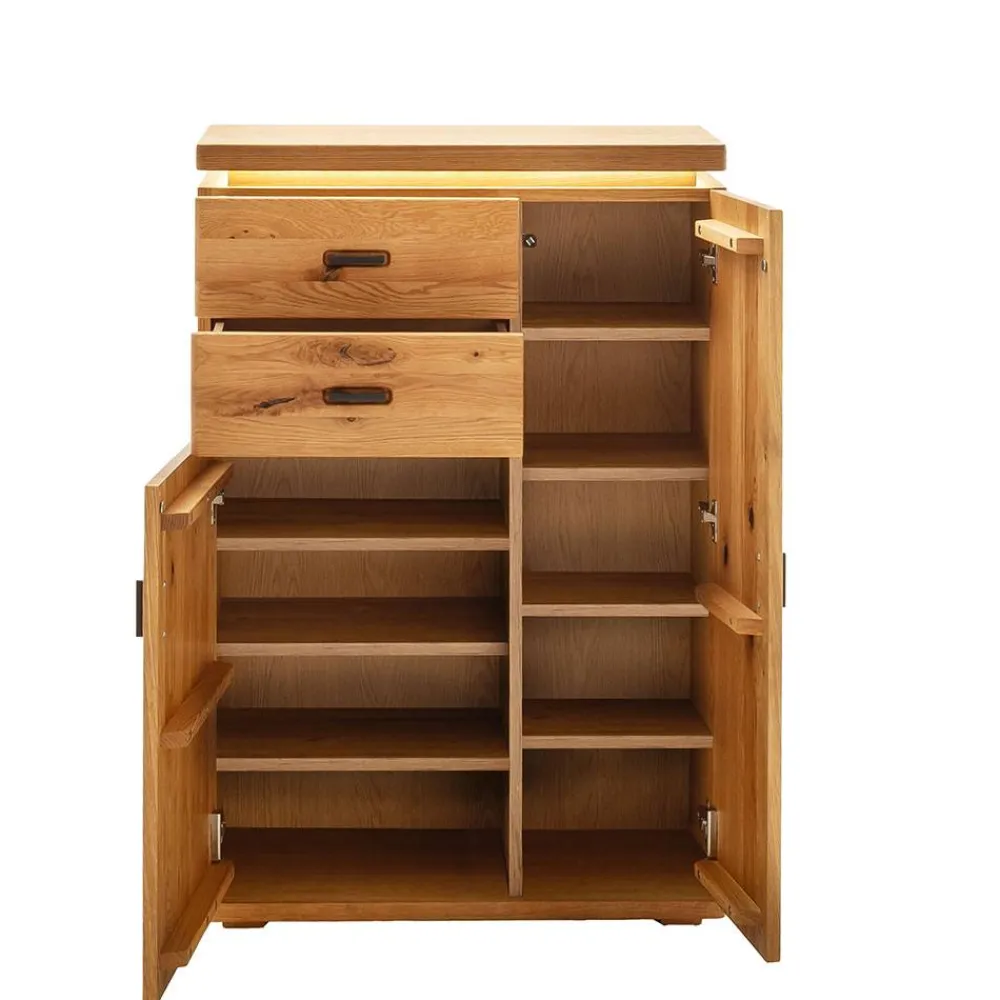 - Innen zwei Konstruktionsböden und fünf verstellbare Einlegeböden, Platz für bis zu 13 Paar Schuhe bis Größe 39