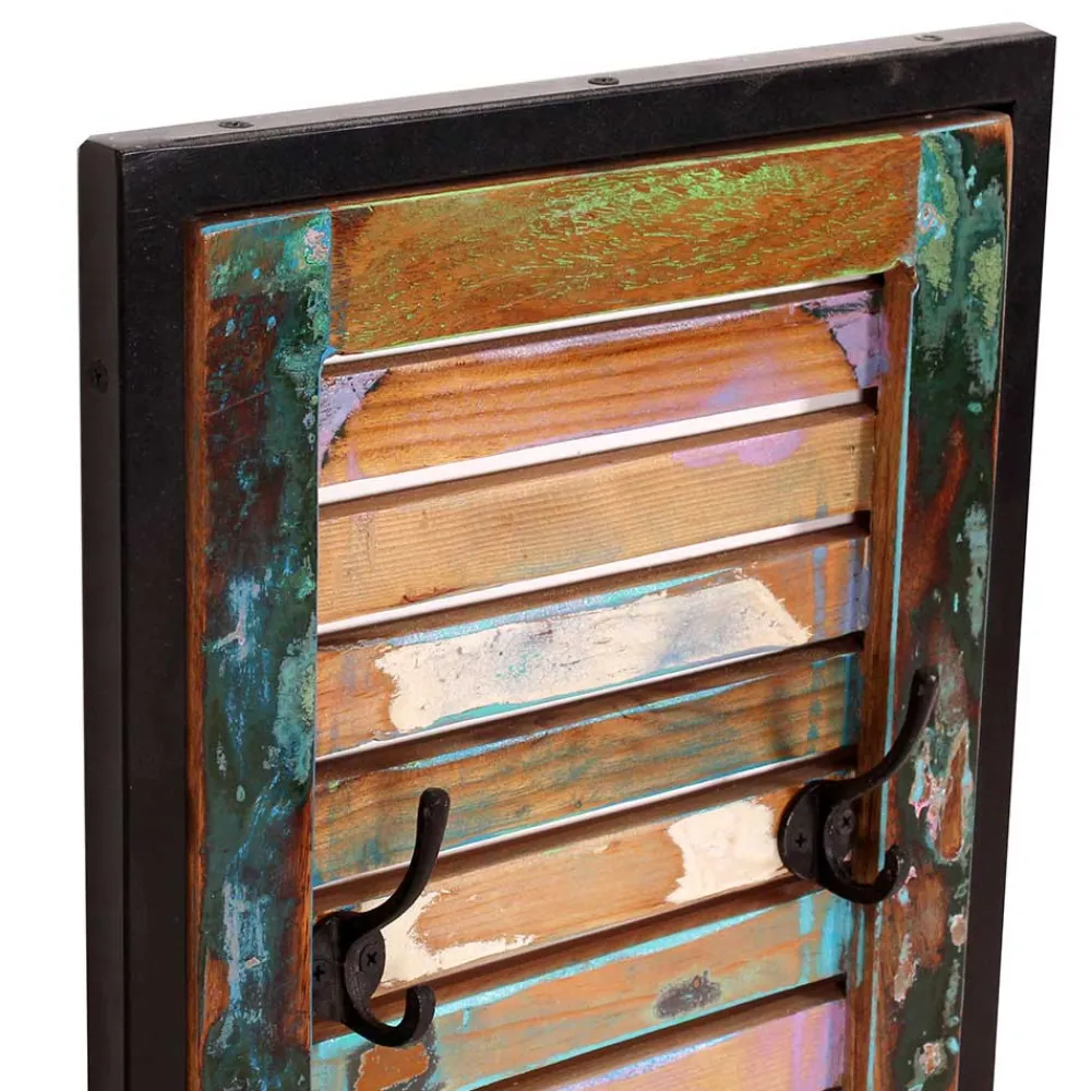 Das Garderobenpaneel „Vosbadus“ beeindruckt durch seine lebendige Farbgebung. In einer Palette aus strahlendem Bunt und klassischem Antikschwarz bringt es sowohl Frische als auch zeitlose Eleganz in Ihre Räume. Recyclingholz, ein Material, das aus wiederverwendetem Holz gewonnen wird, sorgt für eine unverwechselbare, rustikale Ästhetik. Neben seiner umweltfreundlichen Herkunft zeichnet sich Recyclingholz durch außergewöhnliche Robustheit und Langlebigkeit aus. Altmetall ergänzt diesen Charakter perfekt – seine strukturierten Oberflächen und robusten Eigenschaften schaffen nicht nur eine starke Basis, sondern verleihen dem Paneel auch zusätzliche Tiefe und Stabilität.