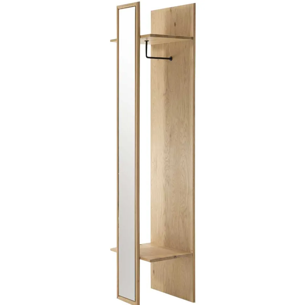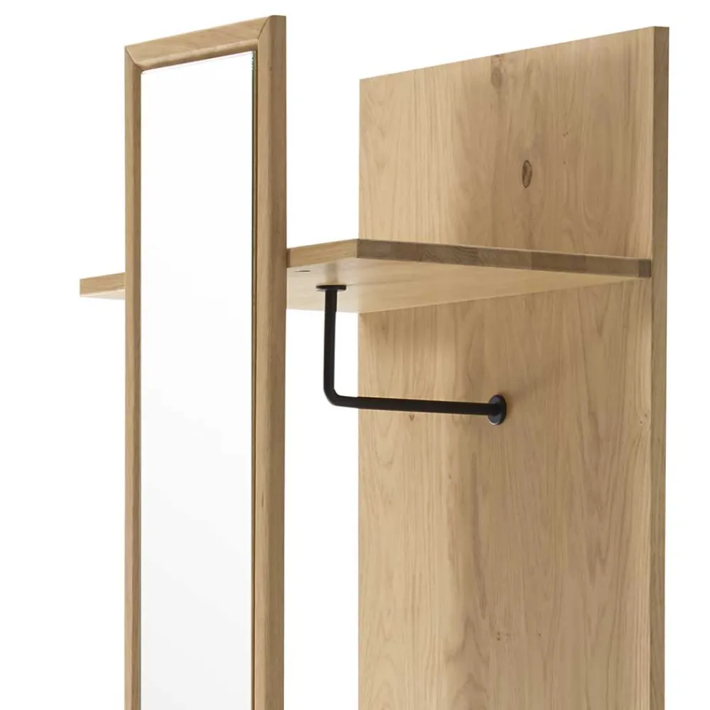 Ausgewählt für ihre Langlebigkeit und Ästhetik, wird die Garderobe aus massivem Wildeichenholz gefertigt. Wildeiche ist nicht nur bekannt für ihre Robustheit, sondern auch für ihre einzigartigen, lebhaften Maserungen, die jedes Möbelstück zu einem Unikat machen. Dazu kommt ein Spiegelglas, das den Raum optisch erweitert und für mehr Licht sorgt. Der schwarze Metallteil, der als Kleiderstange dient, fügt dem Ganzen eine industrielle Note hinzu, die dem Möbelstück eine besondere Tiefe verleiht.