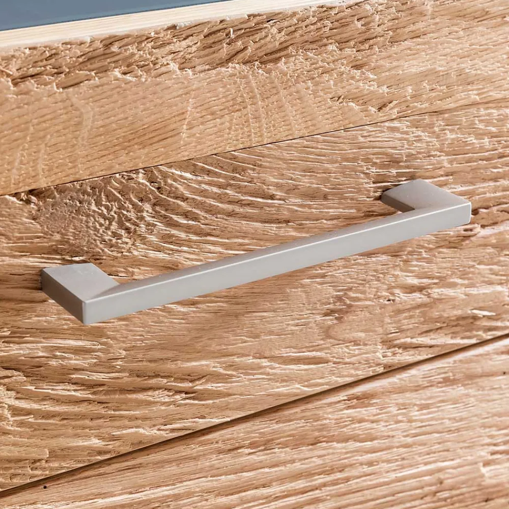 Die Oberflächen sind sorgfältig mit Balkeneiche furniert und lackiert, was dem Set einen edlen Glanz und zusätzlichen Schutz vor Abnutzung verleiht. Die Fronten des Sets wurden zusätzlich grob gebürstet und geschliffen, was eine fühlbare Textur schafft und das natürliche Muster der Holzmaserung betont. Die feinen Unebenheiten verleihen dem „Macusos“ Set eine authentische und robuste Optik, die den rustikalen Charme mit modernem Design verbindet.