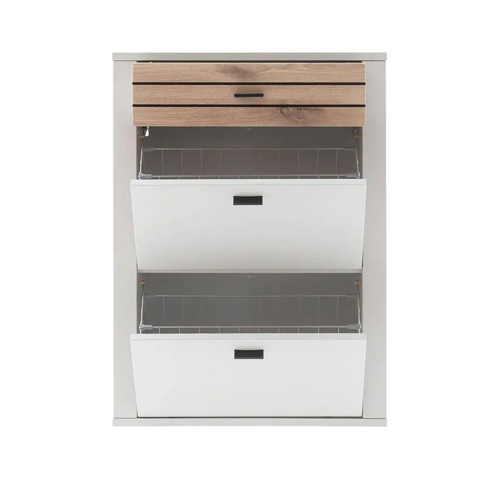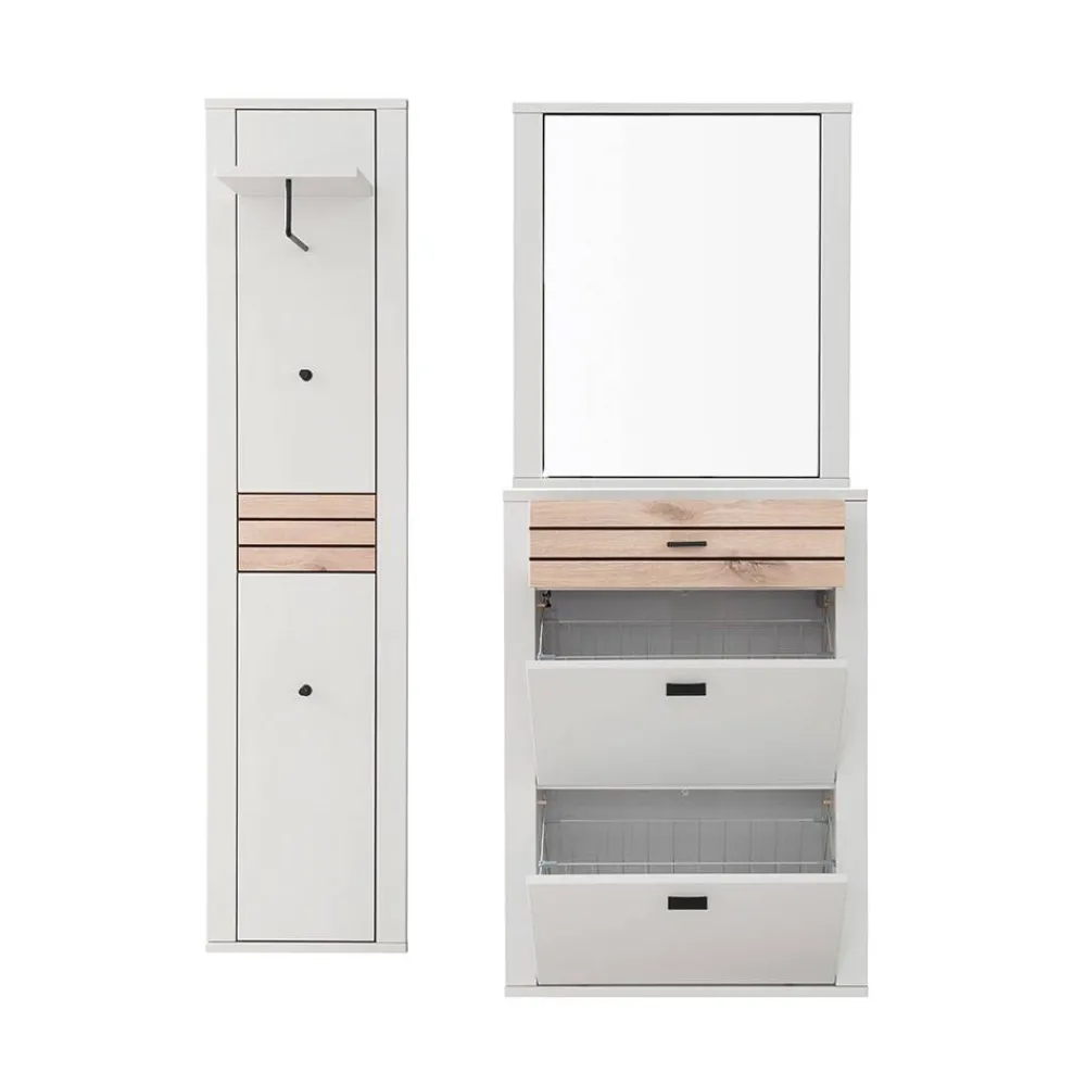 Die schmale Garderobe bietet durch zwei stabile Metall-Kleiderhaken und eine Hutablage mit Metall-Kleiderstange praktischen Stauraum für Jacken und Accessoires. Der Schuhkipper ermöglicht eine geordnete Aufbewahrung von Schuhen durch zwei gedämpfte Schuhklappen mit integrierten Doppel-Metallschuhkörben. Der 73 cm breite Spiegel ergänzt das Set durch seine großzügige Reflexionsfläche und vergrößert optisch den Raum.