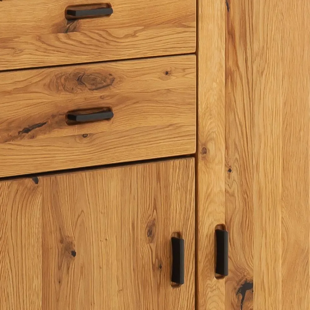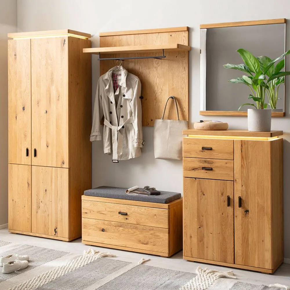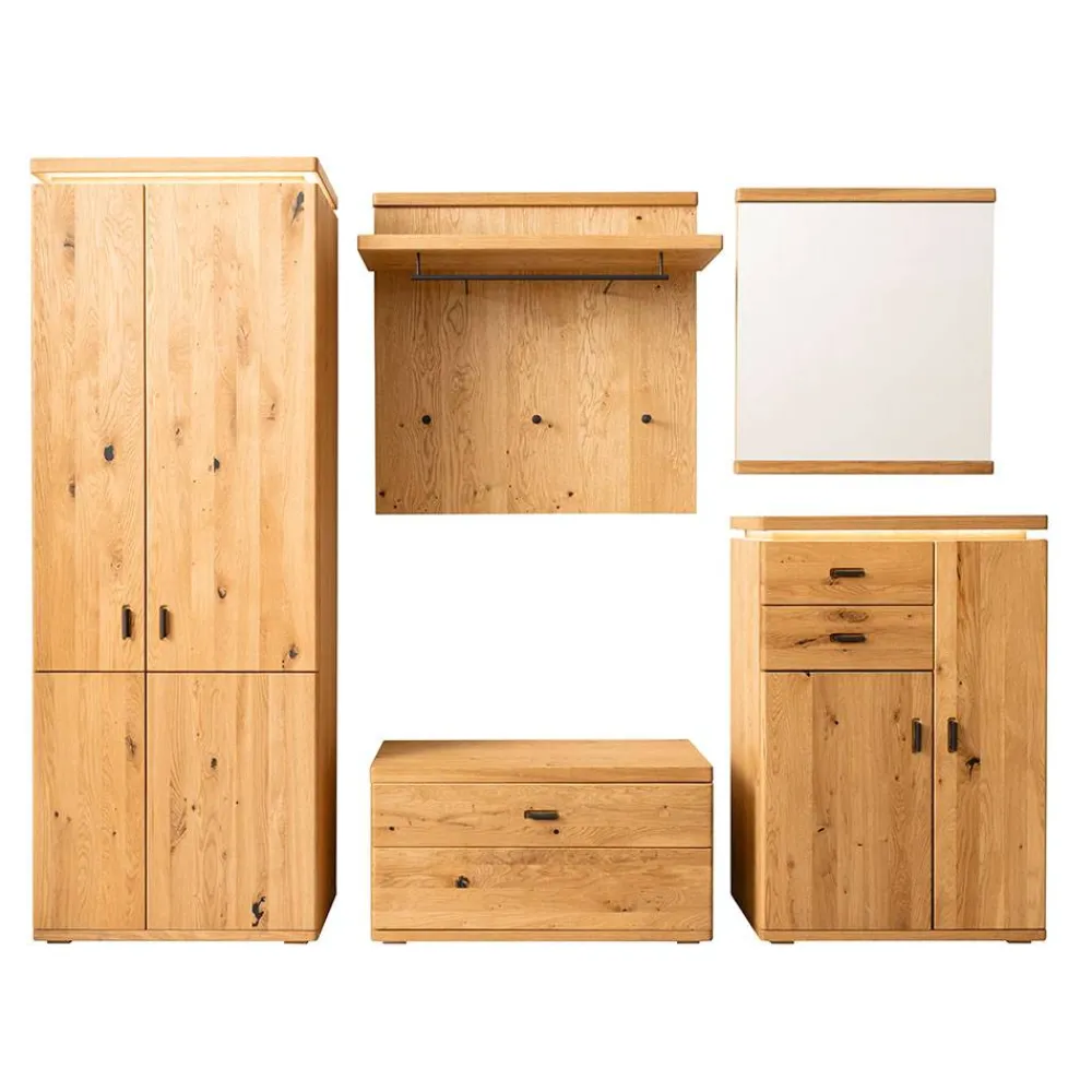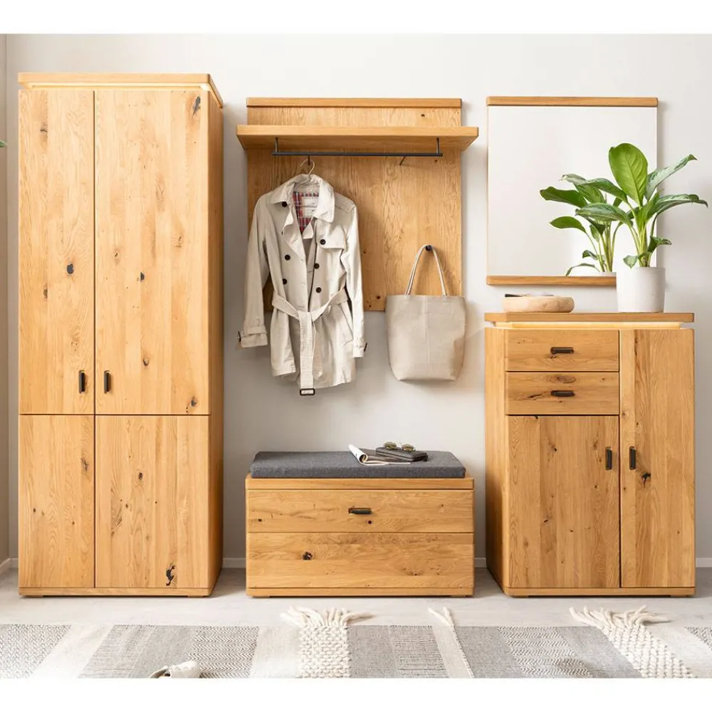 Mit der fünfteiligen Flureinrichtung „Robats“ holen Sie sich eine perfekt abgestimmte Kombination aus hochwertigem Design und durchdachter Funktionalität in Ihr Zuhause. Dieses umfassende Set besteht aus Garderobenschrank, Wandgarderobe, Garderobenbank, Flurspiegel und Hochkommode und fügt sich mühelos in moderne und rustikale Einrichtungsstile ein. Die Materialien und Verarbeitung begeistern durch Balkeneiche Massivholz, Wildeiche Furnier und edle, geölte Oberflächen, die die natürliche Schönheit und Qualität der Möbel unterstreichen.
