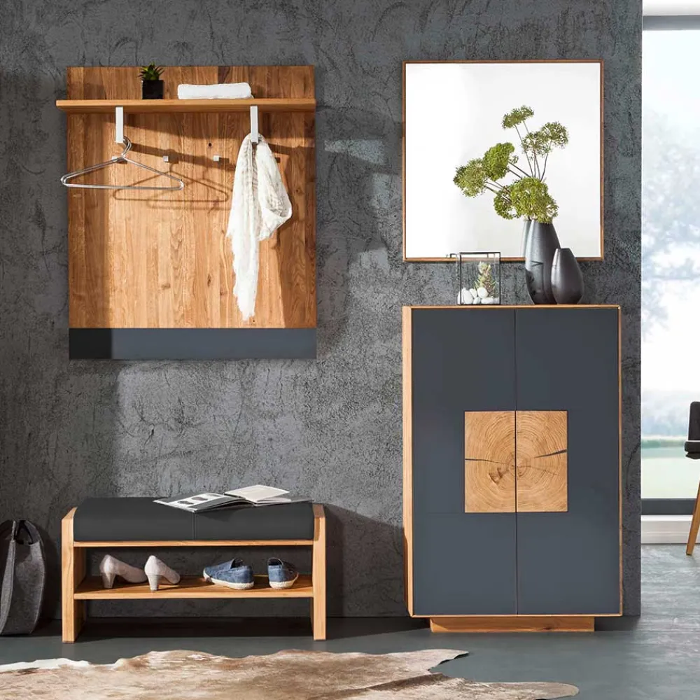 Das „Mandrey“ Garderoben-Set besteht aus einem Schuhschrank, einem Spiegel, einer Wandgarderobe und einer Bank. Jedes Möbelstück wurde sorgfältig aus massivem Wildeicheholz gefertigt. Die natürlichen Wuchsmerkmale wie leichte Risse oder Astlöcher sind gewollt und verleihen den Möbeln einen einzigartigen Charakter. Die gebürsteten und geölten Holzoberflächen unterstreichen die lebhafte Maserung und verleihen dem Set eine warme Ausstrahlung.