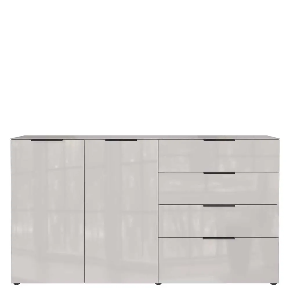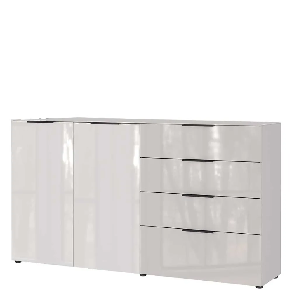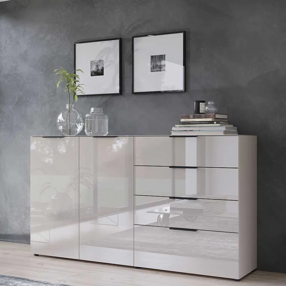 Modernität und zeitlose Eleganz verschmelzen im Design von Aquara zu einem harmonischen Gesamtbild. Hellgraue Oberflächen schaffen eine ruhige, freundliche Atmosphäre, während die Fronten durch ihre Glasbeschichtung eine stilvolle Tiefe und einen leichten Glanz erhalten. Einen starken, charaktervollen Akzent setzen die schwarz pulverbeschichteten Metall-Kantengriffe, die dem Möbelstück eine klare Linienführung und moderne Raffinesse verleihen. Dieses Sideboard ist mehr als nur ein Aufbewahrungsmöbel – es ist ein Statement für gehobene Wohnkultur.