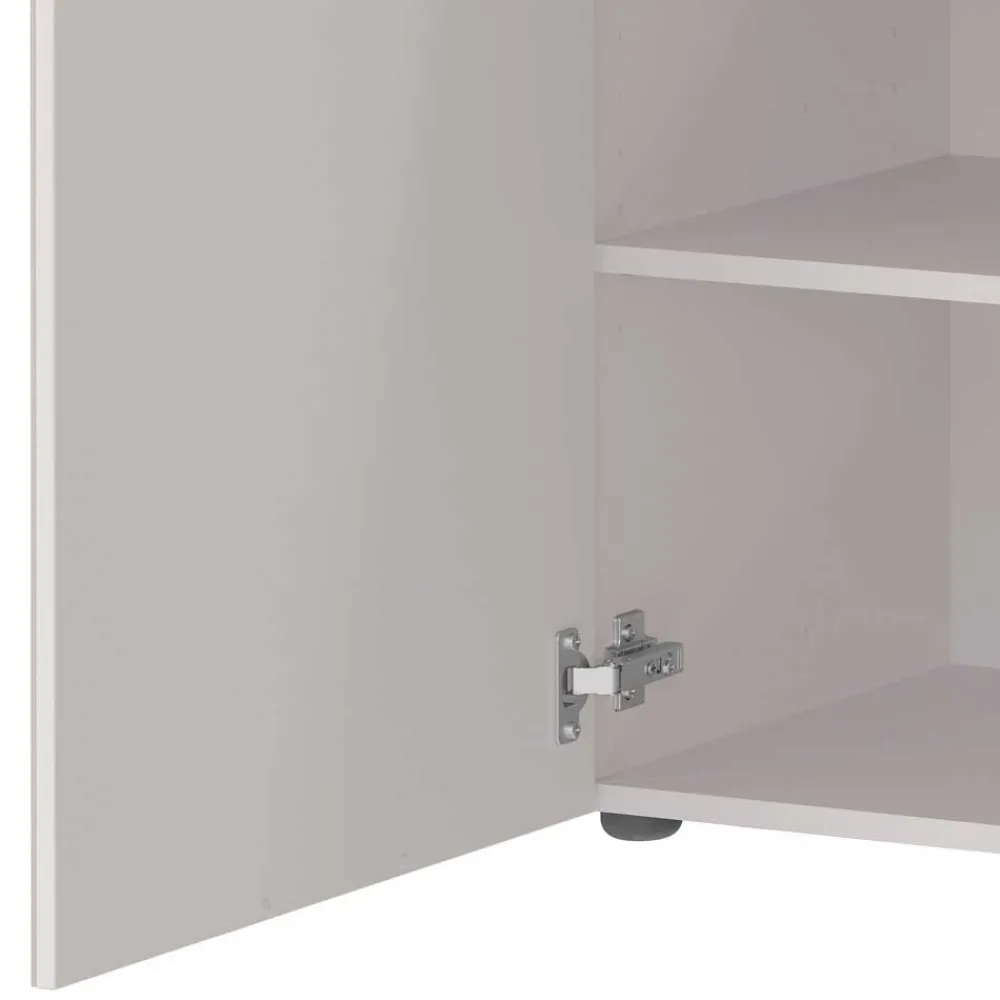 Komplett gefertigt aus robuster Spanplatte, bietet Aquara eine solide und langlebige Basis. Spanplatten zeichnen sich durch hohe Formstabilität und Belastbarkeit aus und eignen sich besonders gut für moderne Möbelkonstruktionen. Die Oberfläche ist melaminbeschichtet, was nicht nur für ein edles Finish sorgt, sondern auch Schutz vor Kratzern, Feuchtigkeit und alltäglicher Abnutzung bietet. Zusätzlich wird die Deckplatte von einer eleganten Sicherheitsglas-Auflage geschützt – ideal für Dekoration oder technische Geräte. Die Front erhält durch ihre Glasbeschichtung eine besonders hochwertige Optik und lässt sich gleichzeitig leicht reinigen. Schwarze Metallgriffe mit Pulverbeschichtung sind kratzfest, langlebig und setzen einen ausdrucksstarken Kontrast zur hellgrauen Oberfläche. Stoßfeste ABS-Kanten sorgen zusätzlich für Schutz an den empfindlichen Rändern und machen Aquara zu einem langlebigen und alltagstauglichen Möbelstück.