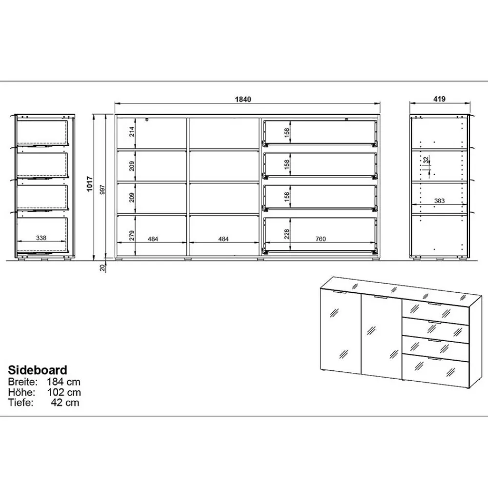 Viel Platz auf kompaktem Raum – mit Maßen von 184 cm Breite, 102 cm Höhe und 42 cm Tiefe bietet das Sideboard großzügigen Stauraum für unterschiedlichste Wohnbereiche. Ob im Wohnzimmer, Flur, Essbereich oder Arbeitszimmer – Aquara passt sich Ihren Bedürfnissen flexibel an. Vier geräumige Schubladen mit leichtgängigem Metallauszug bieten übersichtlichen Stauraum für kleinere Gegenstände. Ausgestattet mit moderner Soft-Close-Funktion schließen die Schubladen besonders leise und sanft. Der integrierte Selbsteinzug sorgt dafür, dass jede Schublade automatisch komplett eingezogen wird – für noch mehr Komfort im Alltag.