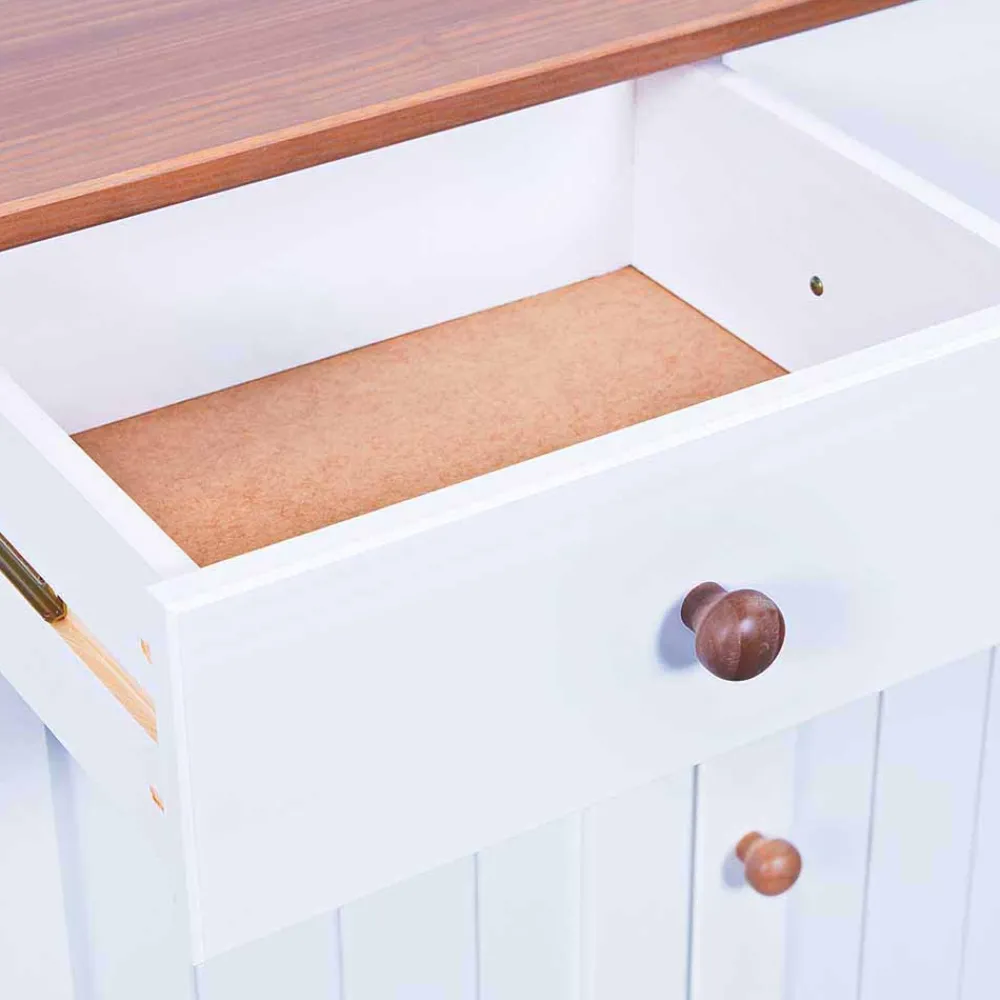 Hinter den Türen verbirgt sich ein durchdachtes Innenleben: Jede Sektion ist mit einem Einlegeboden ausgestattet, der Ihnen hilft, Ordnung zu halten und Ihre Gegenstände übersichtlich zu verstauen. Im Aufsatz befinden sich zudem drei kleine offene Fächer und ein großes Mittelfach, ideal zur Präsentation von Büchern, Fotos oder Erinnerungsstücken. Die Rückwand in Paneeloptik verleiht diesen Fächern zusätzliche Eleganz und Tiefe. Ergänzt wird die Funktionalität durch sechs Schubladen mit robustem Metallauszug, die weiteren Stauraum für kleinere Gegenstände bieten. Die runden Knopfgriffe aus Holz runden das harmonische Gesamtbild ab.