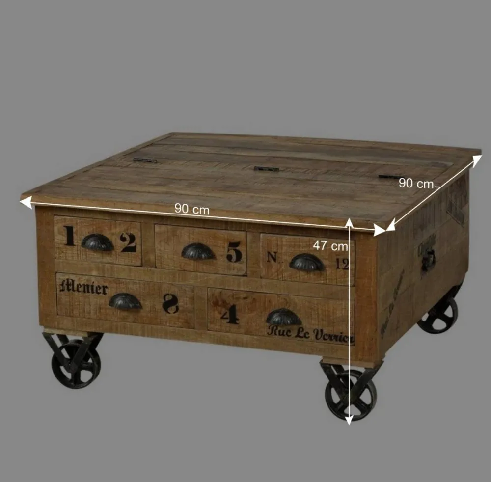 Der Couchtisch steht auf vier markanten Eisenrollen, die ihm nicht nur Stabilität verleihen, sondern auch die Flexibilität, ihn einfach umzupositionieren. Die in Vintage-Schwarz lackierten Muschelgriffe und Eisenrollen bilden einen reizvollen Kontrast zum warmen Ton des Mangobaumholzes.