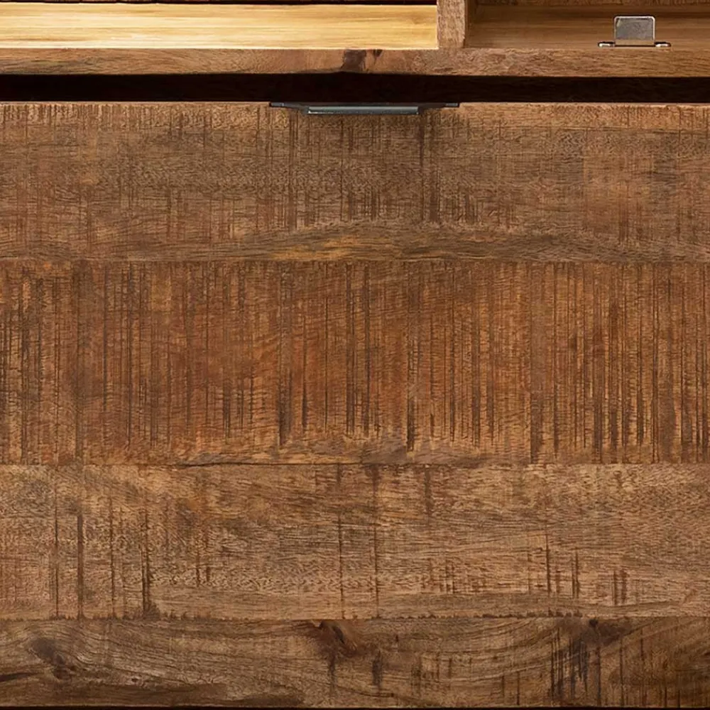 Wir präsentieren Ihnen hier unser hochwertiges Highboard „Acira“ im angesagten Industry und Loft Stil. Dieses außergewöhnliche Möbelstück ist aus nachhaltigem Mangobaum-Recyclingholz und robustem Metall gefertigt und besticht durch seinen interessanten Materialmix und groben Texturen. Die Mangobaumholz-Oberfläche ist lackiert und verleiht dem Highboard mit seiner lebhaften Maserung eine grobe Struktur, die dem Möbelstück einen einzigartigen Charakter beschert.