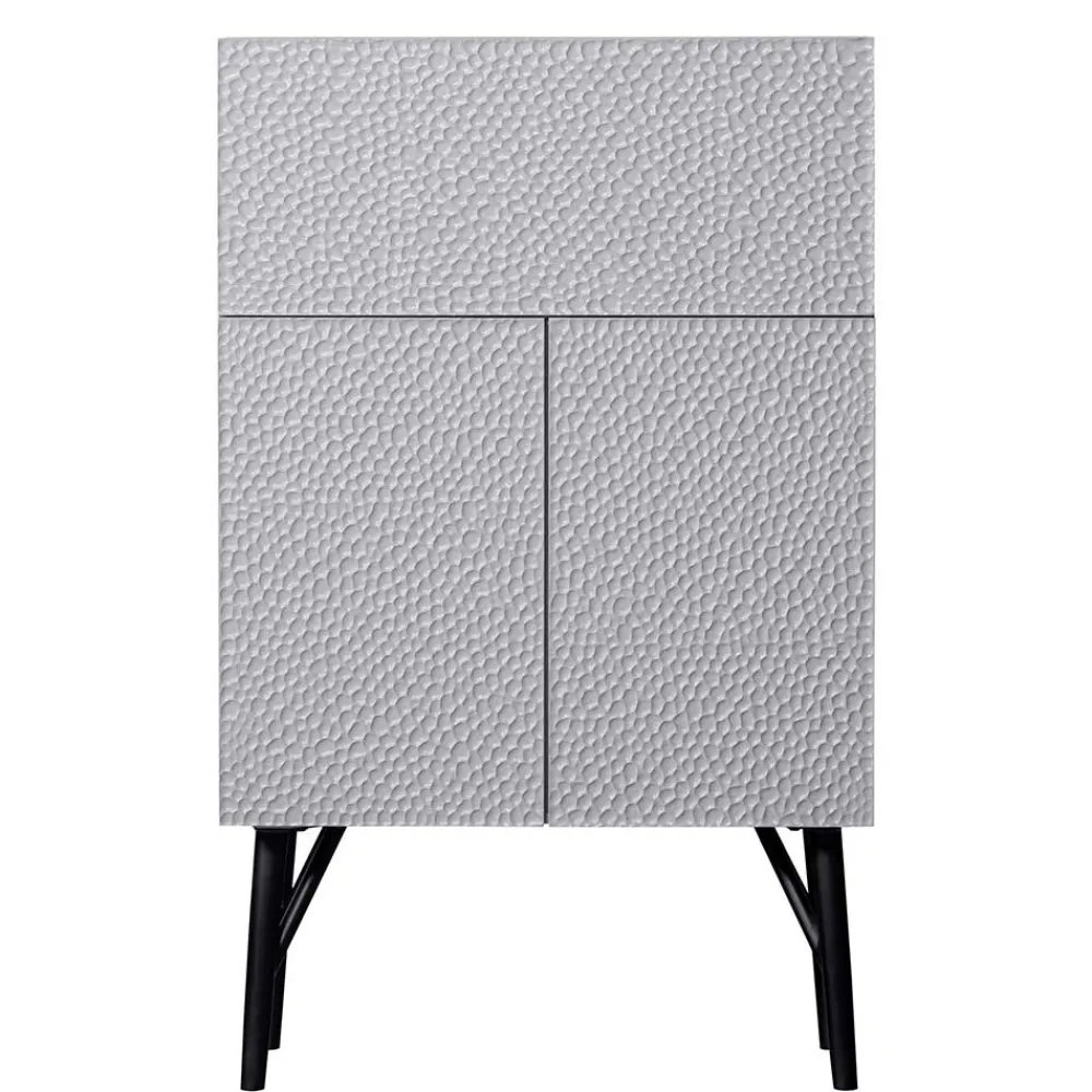 Die Oberflächen des Barschranks sind pflegeleicht lackiert, was ihn besonders pflegefreundlich macht und Ihnen gleichzeitig eine lange Lebensdauer garantiert. Die Türen und die Klappe sind aus geschnitztem Mangoholz gefertigt, das mit einer einzigartigen 3D-Struktur versehen ist – so entsteht eine individuelle und faszinierende Optik, die mit jedem Blick neue Details preisgibt. Der Korpus besteht aus stabilem Kiefernholz, das zusammen mit den Einlegeböden aus Spanplatte und der Rückwand aus HDF für eine robuste Konstruktion sorgt. Abgerundet wird der Look durch das schwarze Metall-Fußgestell, das dem Barschrank eine moderne Leichtigkeit verleiht.