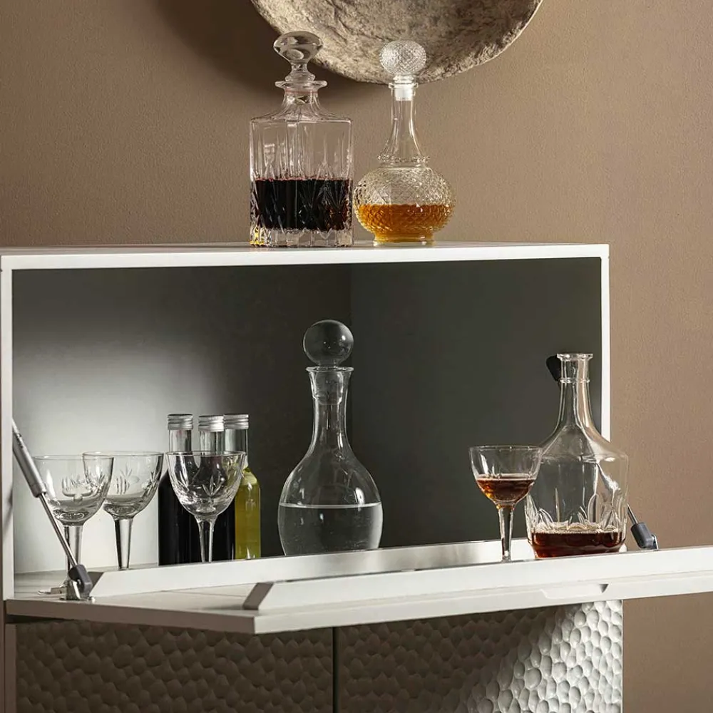 Der „Looning“ Barschrank ist nicht nur ein optisches Highlight, sondern auch ausgesprochen funktional. Hinter der Klappe befindet sich ein praktisches Barfach, das ausreichend Platz für Ihre Lieblingsgetränke und -utensilien bietet. Die beiden Einlegeböden im unteren Bereich sorgen für zusätzliche Ablageflächen, ideal für Gläser, Flaschen oder Dekorationsobjekte. Für die einfache Handhabung ist der Barschrank mit dezent eingefrästen Griffmulden ausgestattet, die das Öffnen der Türen und der Klappe erleichtern.